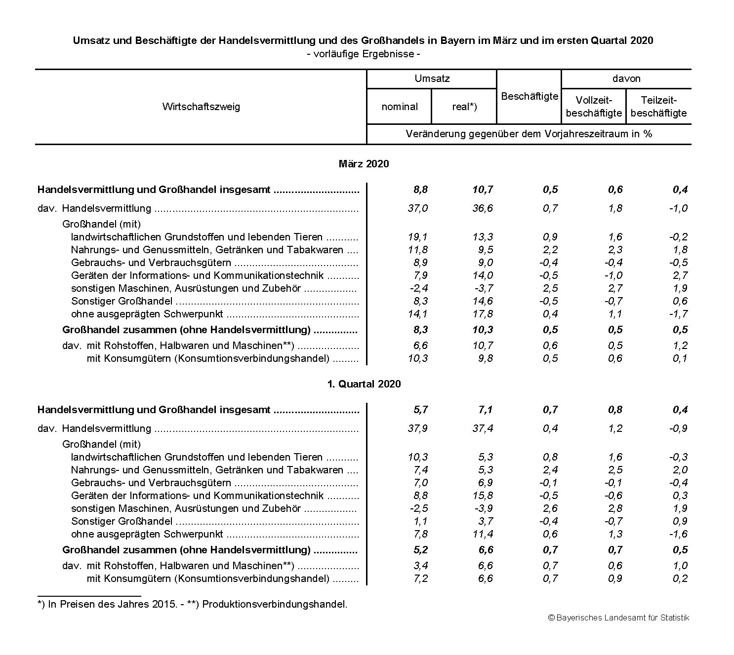 Im Großhandel mit Rohstoffen, Halbwaren und Maschinen (Produktionsverbindungshandel) erhöhte sich der nominale Umsatz im ersten Vierteljahr 2020 um 3,4 Prozent (real: +6,6 Prozent), im Großhandel mit Konsumgütern (Konsumtionsverbindungshandel) stieg der nominale Umsatz um 7,2 Prozent (real: +6,6 Prozent). In der Handelsvermittlung wuchs der nominale Umsatz um 37,9 Prozent (real: +37,4 Prozent).