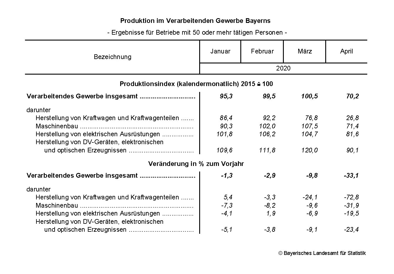 Nach Angaben des Bayerischen Landesamts für Statistik verzeichnete die Produktion des Verarbeitenden Gewerbes im April 2020 gegenüber dem Vorjahresergebnis einen Rückgang von 33,1 Prozent. Die ersten vier Monate des Jahres 2020 erbrachten ein Minus von 12,0 Prozent.