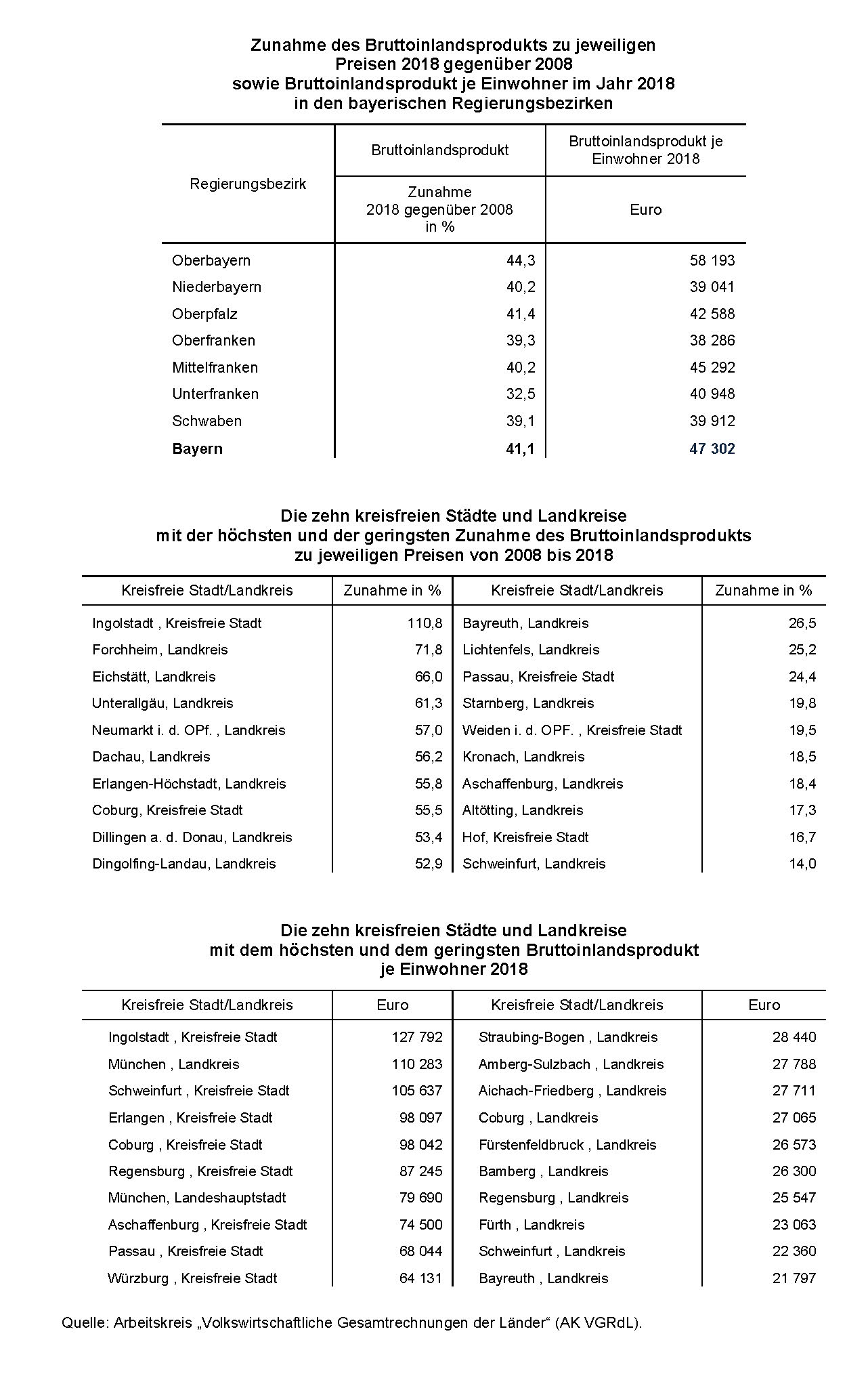 Nach Mitteilung des Bayerischen Landesamts für Statistik erhöhte sich das nominale Bruttoinlandsprodukt in Bayern in der Dekade 2008 bis 2018 um insgesamt 41,1 Prozent. Am stärksten war der Anstieg auf der Ebene der Regierungsbezirke in Oberbayern mit 44,3 Prozent, gefolgt von der Oberpfalz mit 41,4 Prozent. Auf Kreisebene sticht Ingolstadt mit einer Zunahme von 110,8 Prozent hervor, gefolgt von den Landkreisen Forchheim mit 71,8 Prozent und Eichstätt mit 66,0 Prozent. Bezogen auf die Einwohnerzahl war im Jahr 2018 das Bruttoinlandsprodukt in Oberbayern mit 58 193 Euro am höchsten. Bayernweit lag das BIP je Einwohner bei 47 302 Euro.