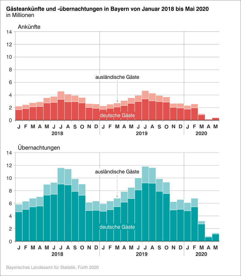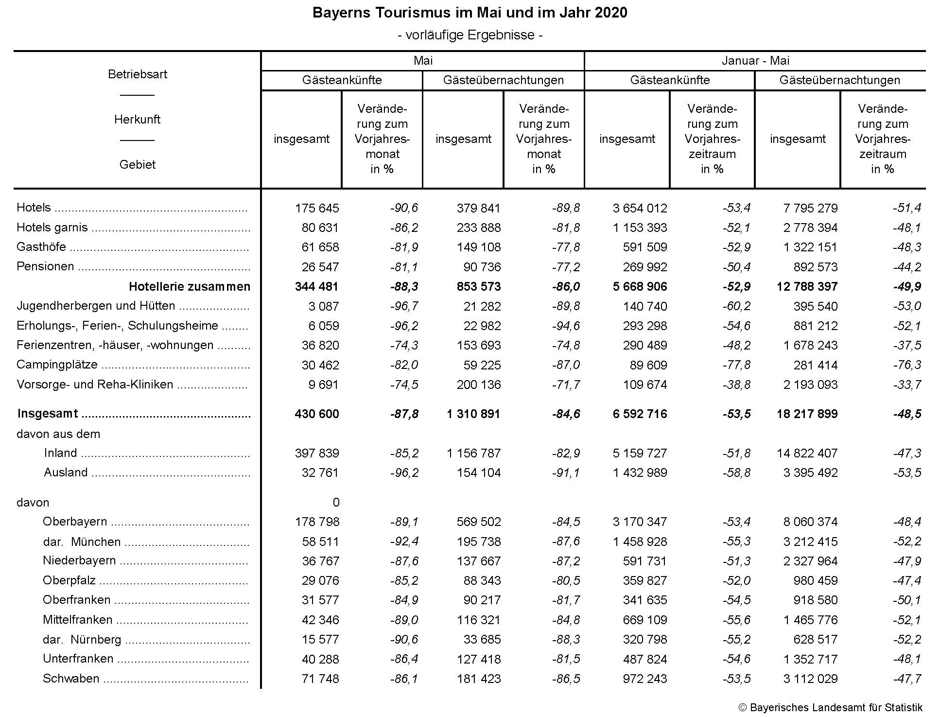Die Übernachtungsmöglichkeiten nutzten im Mai 2020 vor allem inländische Gäste, gerade einmal 7,6 Prozent aller angekommenen Gäste kamen aus dem Ausland. Im Mai 2019 betrug deren Anteil noch 24,2 Prozent. Die Übernachtungszahl der ausländischen Gäste verringerte sich um 91,1 Prozent gegenüber dem Vorjahresmonat. Doch auch bei den inländischen Gästen verzeichneten die bayerischen Beherbergungsbetriebe massive Einbußen. Hier lagen die Gästeankünfte mit rund 398 000 um 85,2 Prozent unter dem Vorjahreswert, die Übernachtungen mit rund 1,2 Millionen um 82,9 Prozent darunter.