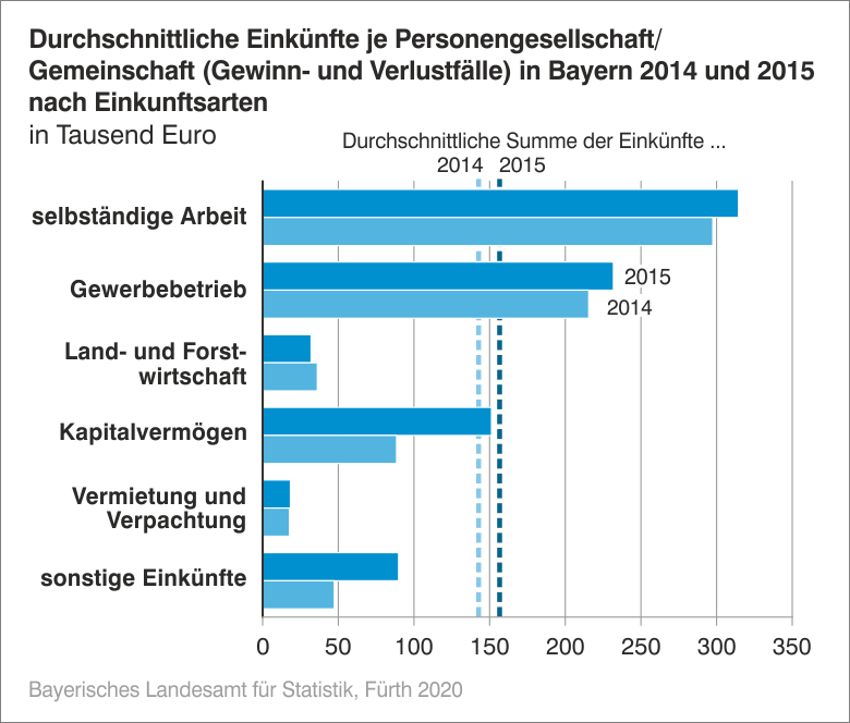 Nach Angaben des Bayerischen Landesamts für Statistik nahmen die bayerischen Finanzämter im Jahr 2015 für 212 561 Personengesellschaften und Gemeinschaften eine gesonderte und einheitliche Feststellung der Einkünfte vor; diese Feststellung ist der Besteuerung der Gesellschafter bzw. Beteiligten vorgelagert. Insgesamt wurden dabei Einkünfte in Höhe von zusammen 33,29 Milliarden Euro ermittelt, das waren 11,8 Prozent mehr als im Vorjahr. 78,0 Prozent der Personengesellschaften und Gemeinschaften erzielten eine positive Summe der Einkünfte, die jedoch nur bei 0,4 Prozent der Fälle fünf Millionen Euro oder mehr betrug. 70,3 Prozent bzw. 23,38 Milliarden Euro der von Personengesellschaften und Gemeinschaften erwirtschafteten Einkünfte waren Einkünfte aus Gewerbebetrieb. Die Mehrzahl (64,1 Prozent) aller Personengesellschaften und Gemeinschaften bestand aus zwei Beteiligten; insgesamt wurden 1,42 Mio. Beteiligte erfasst.