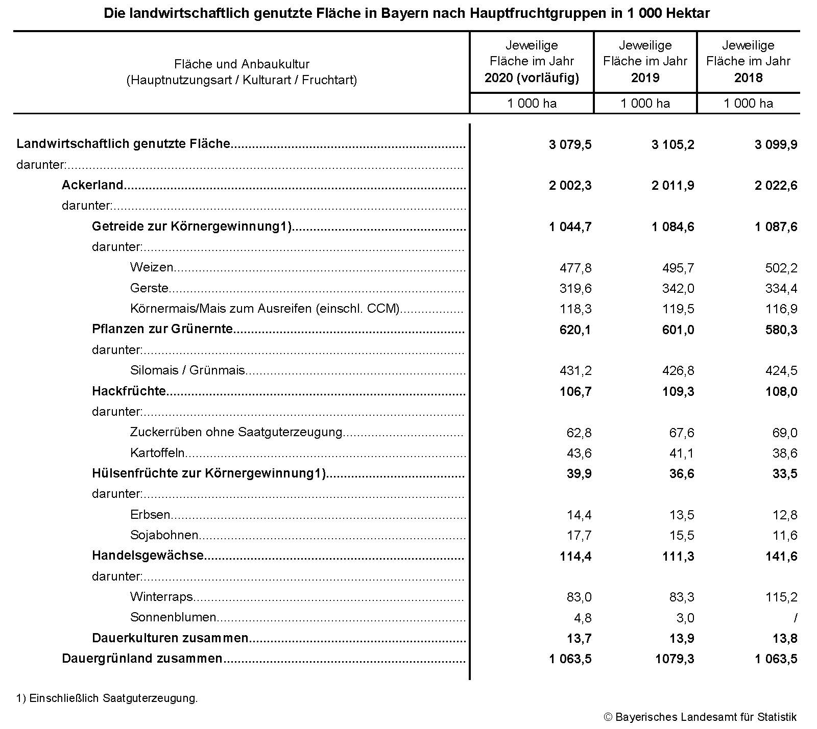 Nach Angaben des Bayerischen Landesamts für Statistik werden in Bayern nach den vorläufigen Ergebnissen der Bodennutzungshaupterhebung 2020 rund 3 079 500 Hektar landwirtschaftlich genutzte Fläche bzw. 2 002 300 Hektar Ackerland bewirtschaftet. Mit 549 500 Hektar ist ein Viertel der bayerischen Ackerfläche mit Mais bestellt.