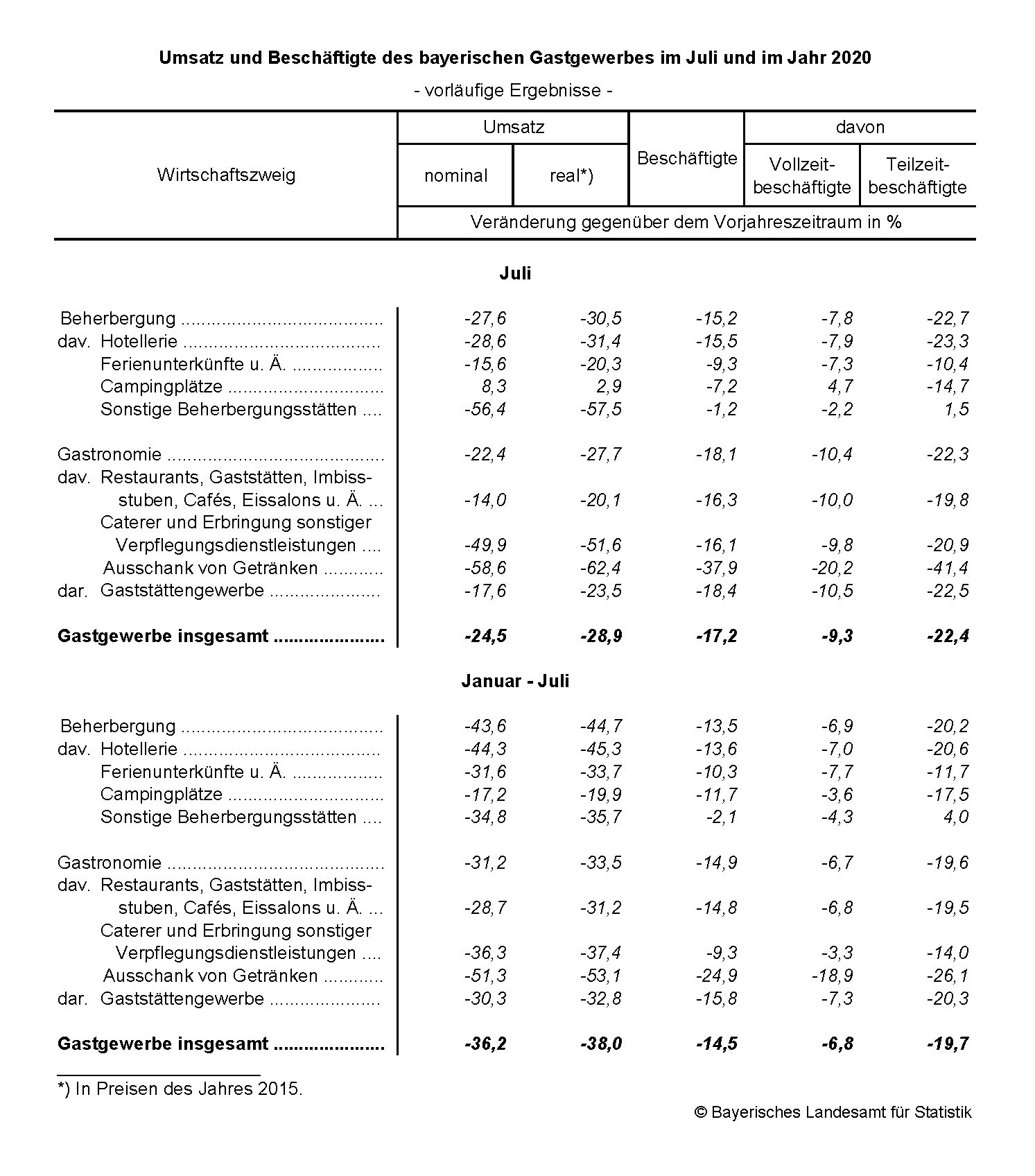 In den ersten sieben Monaten 2020 verringerte sich der nominale Umsatz des bayerischen Gastgewerbe gegenüber dem Vorjahreszeitraum um 36,2 Prozent (real: -38,0 Prozent). Die Zahl der Beschäftigten nahm um 14,5 Prozent ab.