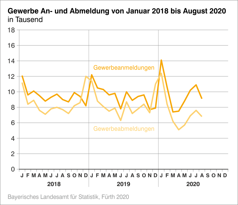 Nach Angaben des Bayerischen Landesamts für Statistik wurden bei den Gewerbeämtern in Bayern im August 2020 insgesamt 9 087 Gewerbe angemeldet und 6 830 abgemeldet. Davon waren 7 275 Neugründungen und 5 115 vollständige Aufgaben. Gegenüber dem Vormonat ist die Zahl der Neugründungen um fast 17 Prozent zurückgegangen. Allerdings verzeichnete auch die Zahl der vollständigen Aufgaben einen Rückgang gegenüber dem Juli 2020 um 9,1 Prozent. Bedingt durch die bayerischen Ferien ist die Gründungsaktivität im Sommermonat August aber auch in den Vorjahren geringer gewesen.