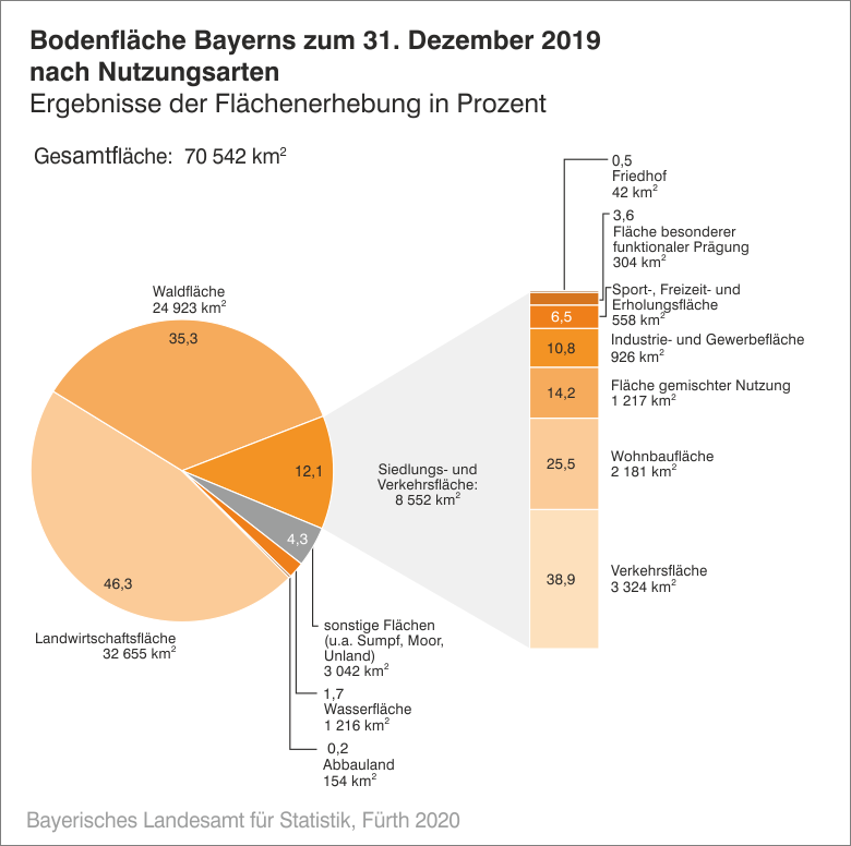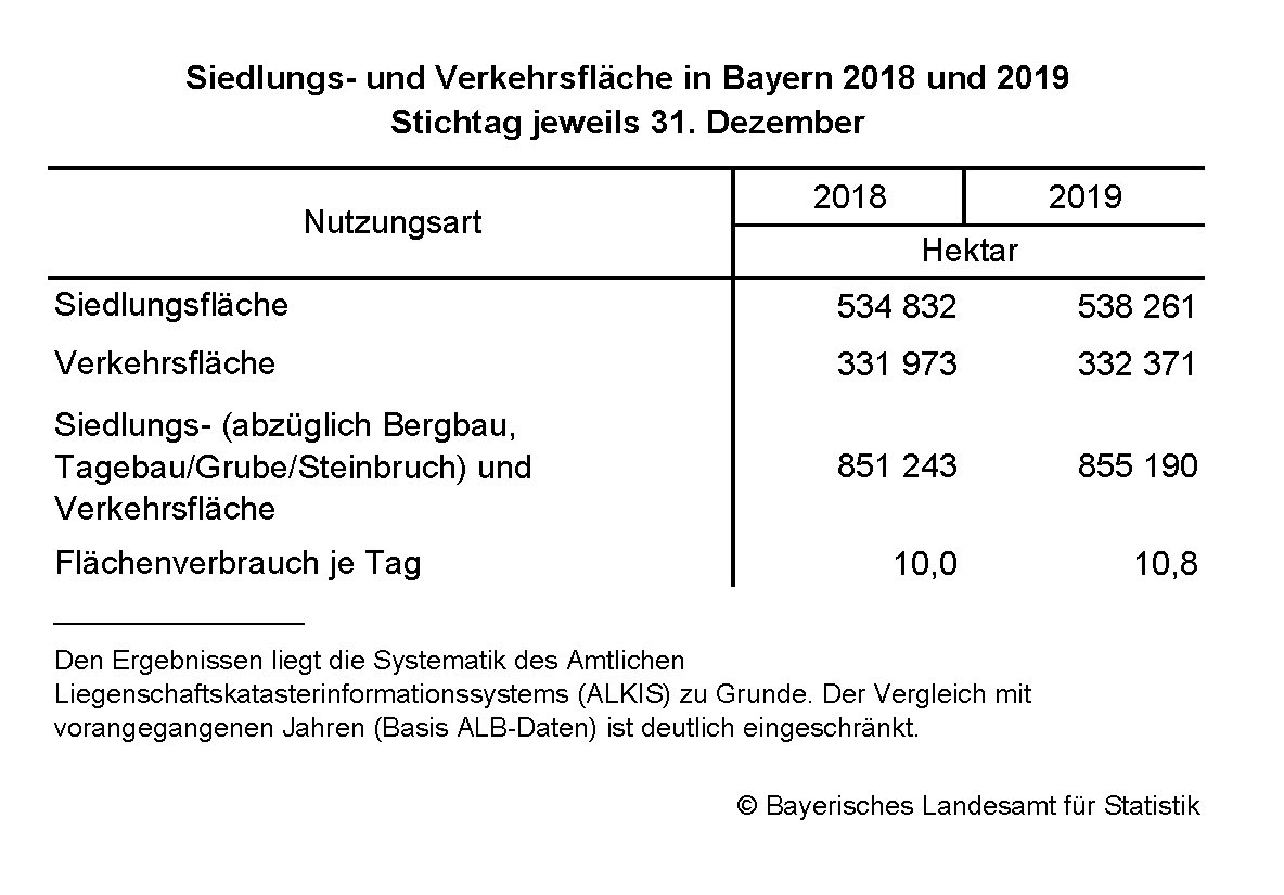 Wie die Auswertung des Amtlichen Liegenschaftskataster-Informationssystems (ALKIS) der Vermessungsverwaltung durch das Bayerische Landesamt für Statistik ergab, belief sich die Siedlungs- und Verkehrsfläche in Bayern zum Stichtag 31. Dezember 2019 auf 855 190 Hektar, das waren 12,1 Prozent der gesamten Landesfläche des Freistaats (rund 70 542 km²). Gegenüber Ende 2018 nahm die Siedlungs- und Verkehrsfläche um 3 948 Hektar bzw. 0,5 Prozent zu. Das bedeutet, dass in Bayern im Jahr 2019 im Durchschnitt jeden Tag eine Fläche von 10,8 Hektar – das entspricht in etwa der Fläche von 15 Fußballplätzen (70m x 100m) – zusätzlich für Siedlungs- und Verkehrszwecke in Anspruch genommen wurde. Da die Siedlungs- und Verkehrsfläche auch Grün- und Freiflächen beinhaltet, kann dieser Flächenverbrauch allerdings nicht mit Versiegelung (Überbauung, Betonierung, Asphaltierung usw.) gleich gesetzt werden.