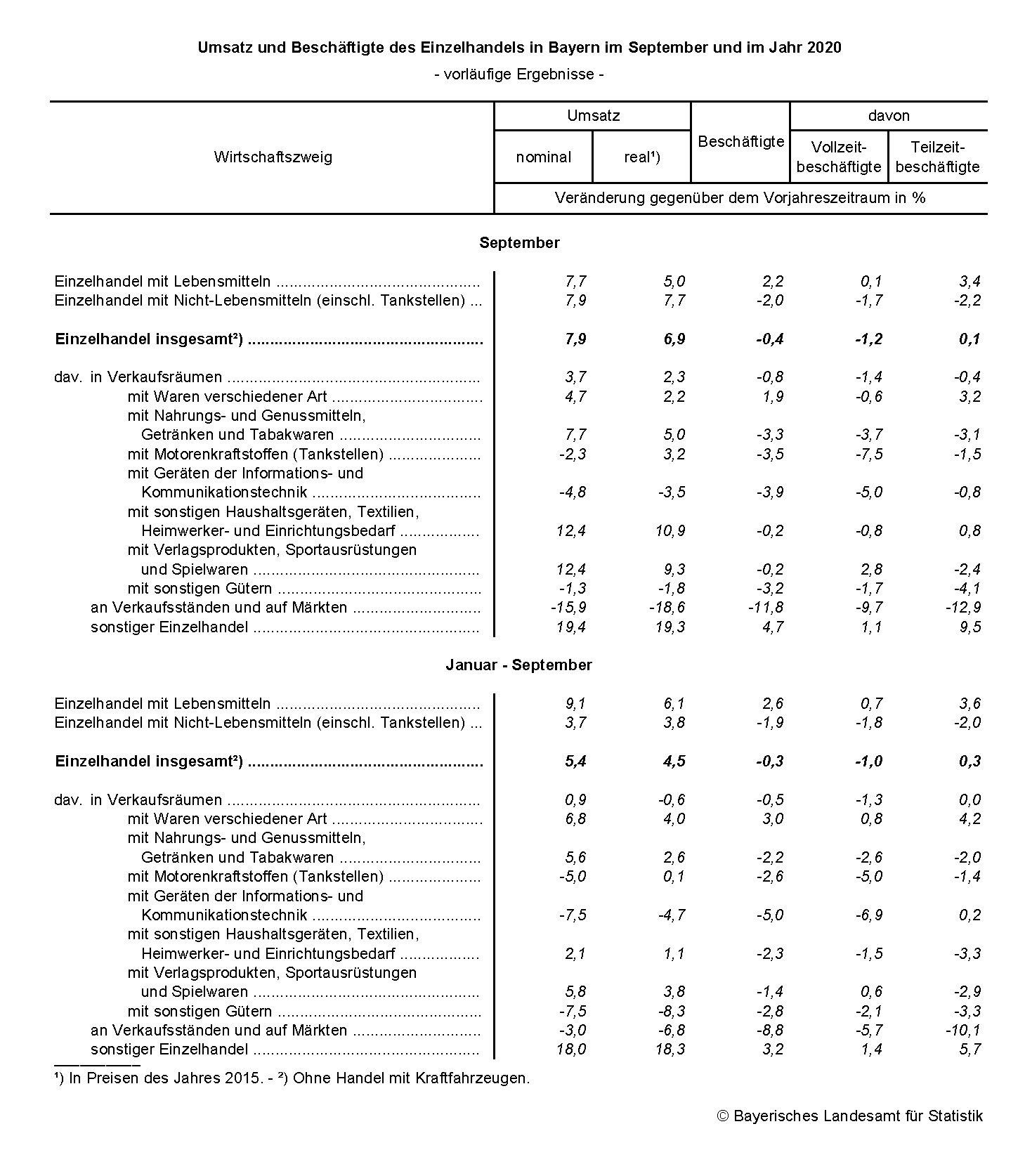 Im September 2020 stieg der nominale Umsatz des bayerischen Einzelhandels gegenüber dem September 2019 nominal um 7,9 Prozent und real um 6,9 Prozent. Im Vergleich zum August 2020 nahm der Umsatz um 0,9 Prozent zu.