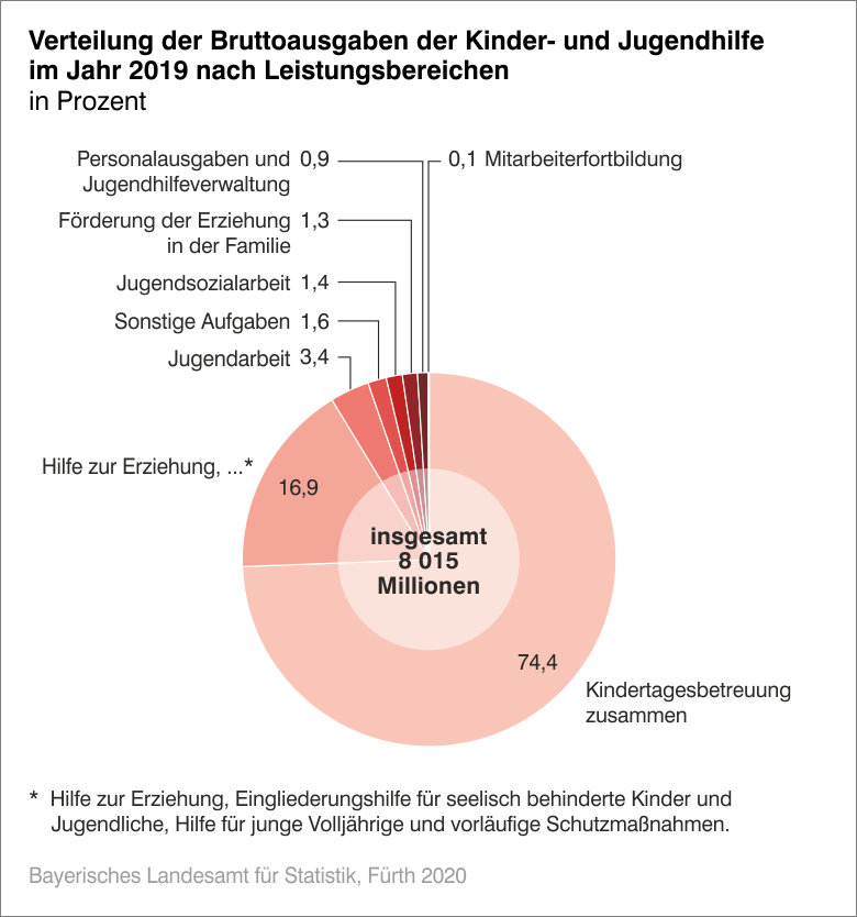 Wie das Bayerische Landesamt für Statistik weiter mitteilt, wurden von den Bruttoausgaben 4 394 Millionen Euro für Leistungen öffentlicher Träger und 3 620 Millionen Euro als Zuschuss an freie Träger verausgabt.