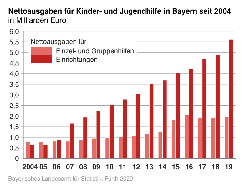 Im Laufe des Jahres 2019 fielen in Bayern für Leistungen und Aufgaben der Kinder- und Jugendhilfe insgesamt Ausgaben in Höhe von 8 015 Millionen Euro an. Gegenüber dem Vorjahr (7 329 Millionen Euro) entspricht das einer Steigung von 9,4 Prozent. Die Nettoausgaben nach Abzug der Einnahmen lagen bei 7 548 Millionen Euro und damit 11,0 Prozent über dem Vorjahresniveau (6 795 Millionen Euro).