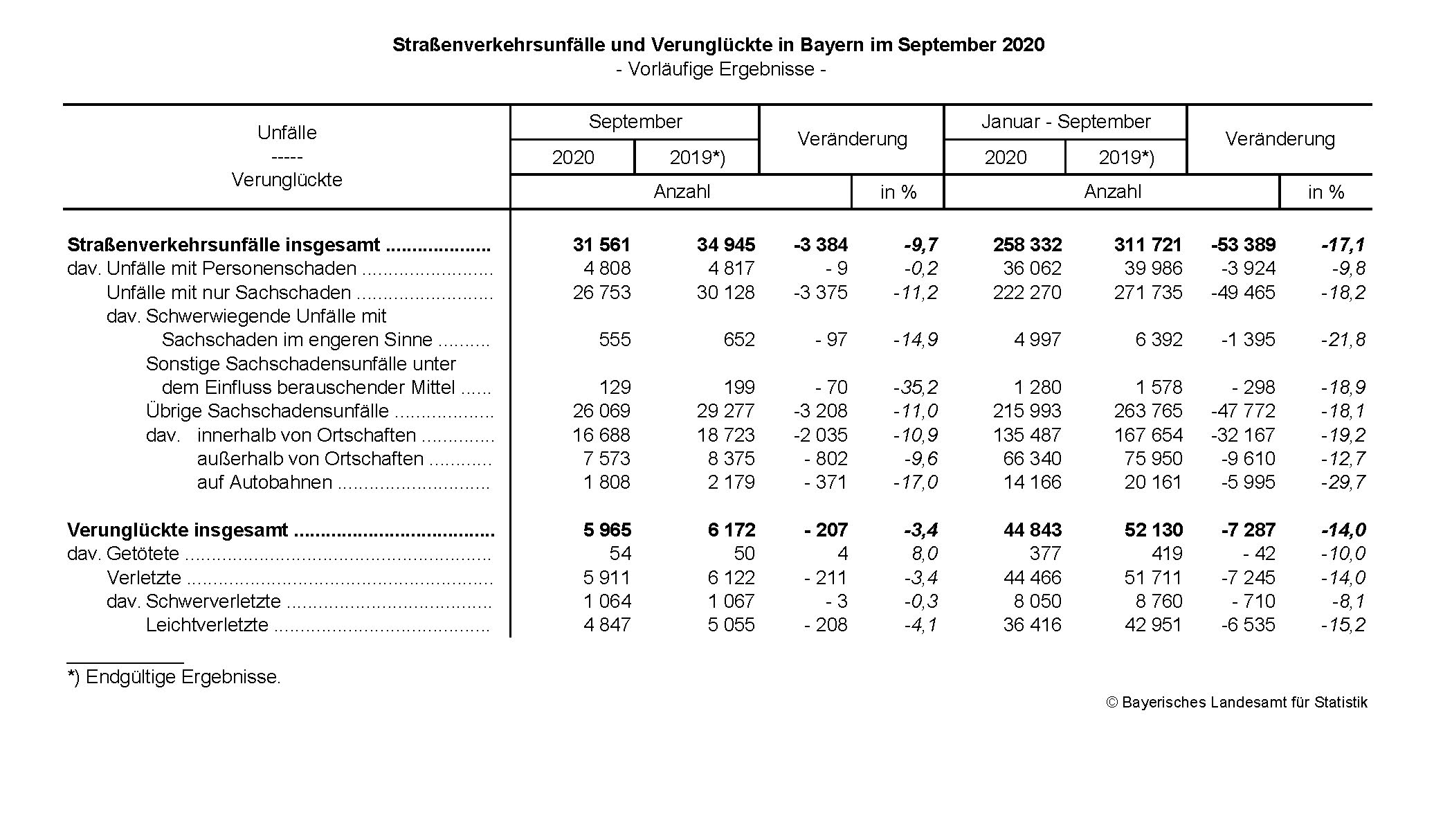 Im Zeitraum von Januar bis September 2020 ereigneten sich 258 332 Unfälle und damit 17,1 Prozent weniger als im Vorjahreszeitraum. Die Anzahl der Verunglückten sank im Vergleichszeitraum um 14,0 Prozent.