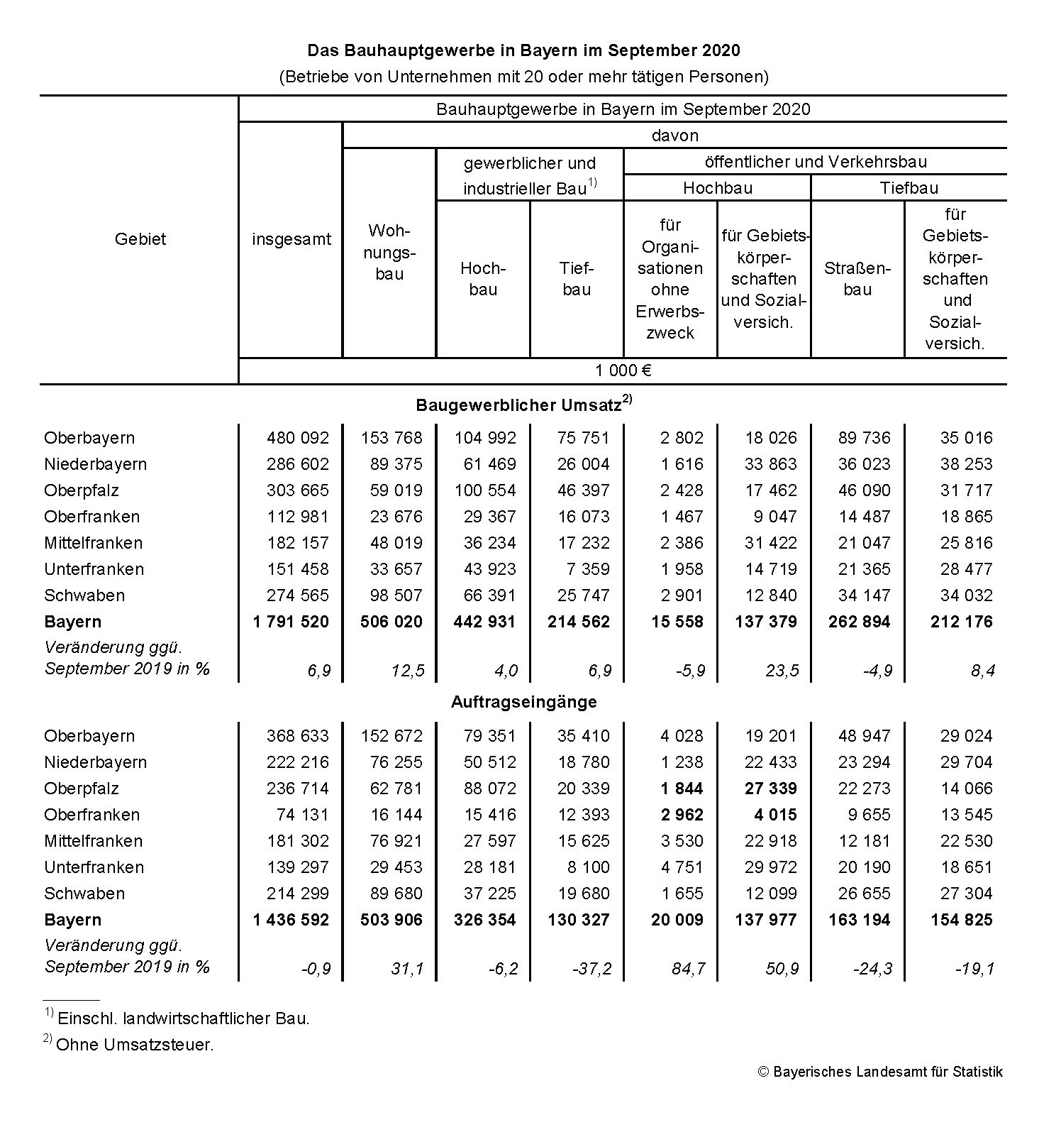 Zu diesem positiven Umsatzergebnis haben mit Ausnahme Schwabens (-3,5 Prozent gegenüber September 2019) alle bayerischen Regierungsbezirke sowie ausgenommen den Hochbau für Organisationen ohne Erwerbszweck und den Straßenbau (-5,9 Prozent bzw. -4,9 Prozent) alle Bausparten beigetragen. Nach Regierungsbezirken unterschieden, verzeichnete Mittelfranken das relativ stärkste Umsatzplus (+50,4 Prozent) und nach Bausparten differenziert der öffentliche Hochbau für Gebietskörperschaften und Sozialversicherungen (+23,5 Prozent). Der jeweils größte Umsatzanteil entfiel auf Oberbayern (26,8 Prozent; +1,6 Prozent) und den Wohnungsbau (28,2 Prozent; +12,5 Prozent).