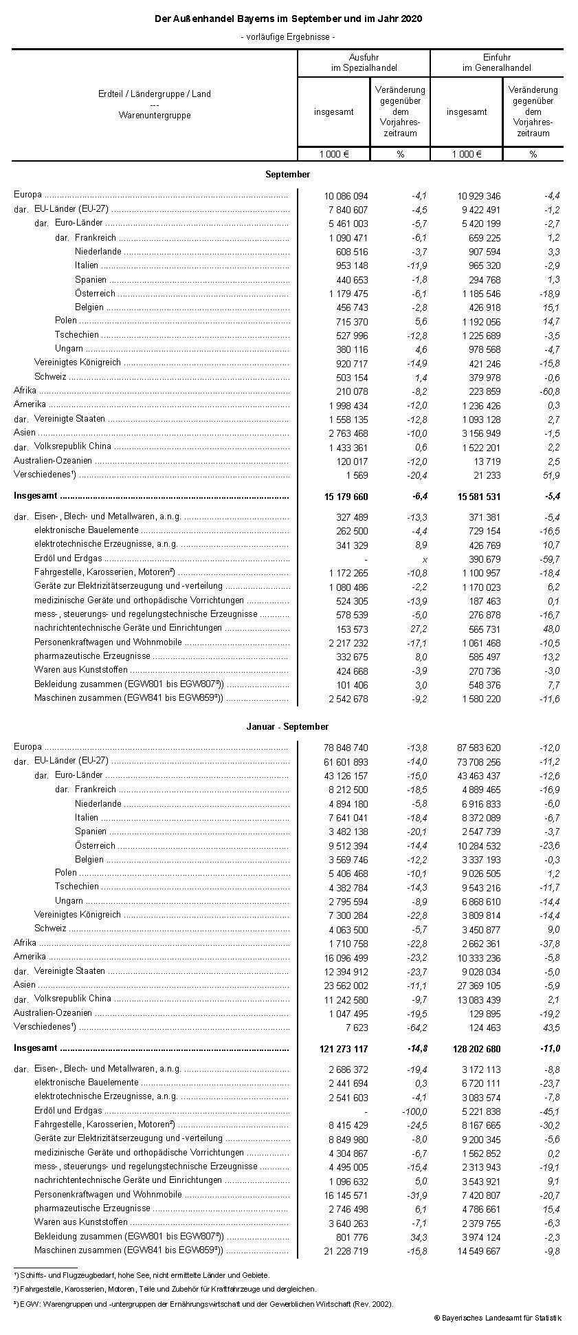 Nach den vorläufigen Ergebnissen des Bayerischen Landesamts für Statistik exportierte die bayerische Wirtschaft im ersten Dreivierteljahr 2020 Waren im Wert von knapp 121,3 Milliarden Euro, dies sind 14,8 Prozent weniger als im Vorjahreszeitraum. Die Importe der bayerischen Wirtschaft sanken zeitgleich um 11,0 Prozent auf rund 128,2 Milliarden  Euro.