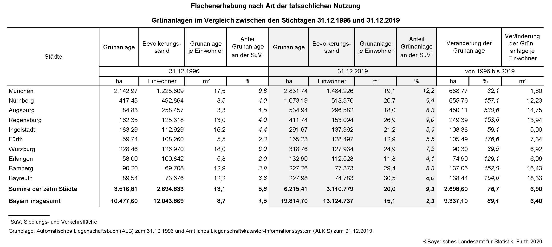 In den zehn bevölkerungsreichsten Städten Bayerns standen den Bewohnern Ende 2019 insgesamt 622 Hektar bzw. rein rechnerisch 20,0 m² Grünanlagenfläche je Einwohner zur Verfügung, das waren 270 Hektar (+76,7 Prozent) oder 6,9 m² je Einwohner mehr (+52,7 Prozent) als noch vor 23 Jahren.