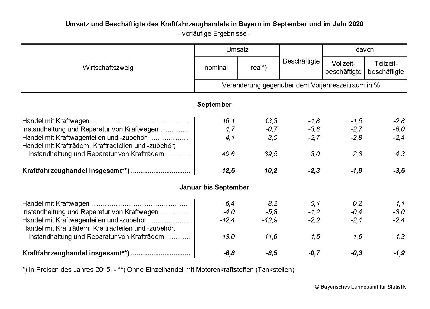 Im September 2020 wuchs der nominale Umsatz im bayerischen Kfz-Handel im Vergleich zum Vorjahresmonat um 12,6 Prozent (real: +10,2 Prozent), die Zahl der Beschäftigten ging allerdings um 2,3 Prozent zurück. Zweistellige Umsatzsteigerungen verbuchten der „Handel mit Kraftwagen“ (nominal: +16,1 Prozent; real: +13,3 Prozent) und der „Handel mit Krafträdern, Kraftradteilen und –zubehör; Instandhaltung und Reparatur von Krafträdern (nominal: +40,6 Prozent; real: +39,5 Prozent).