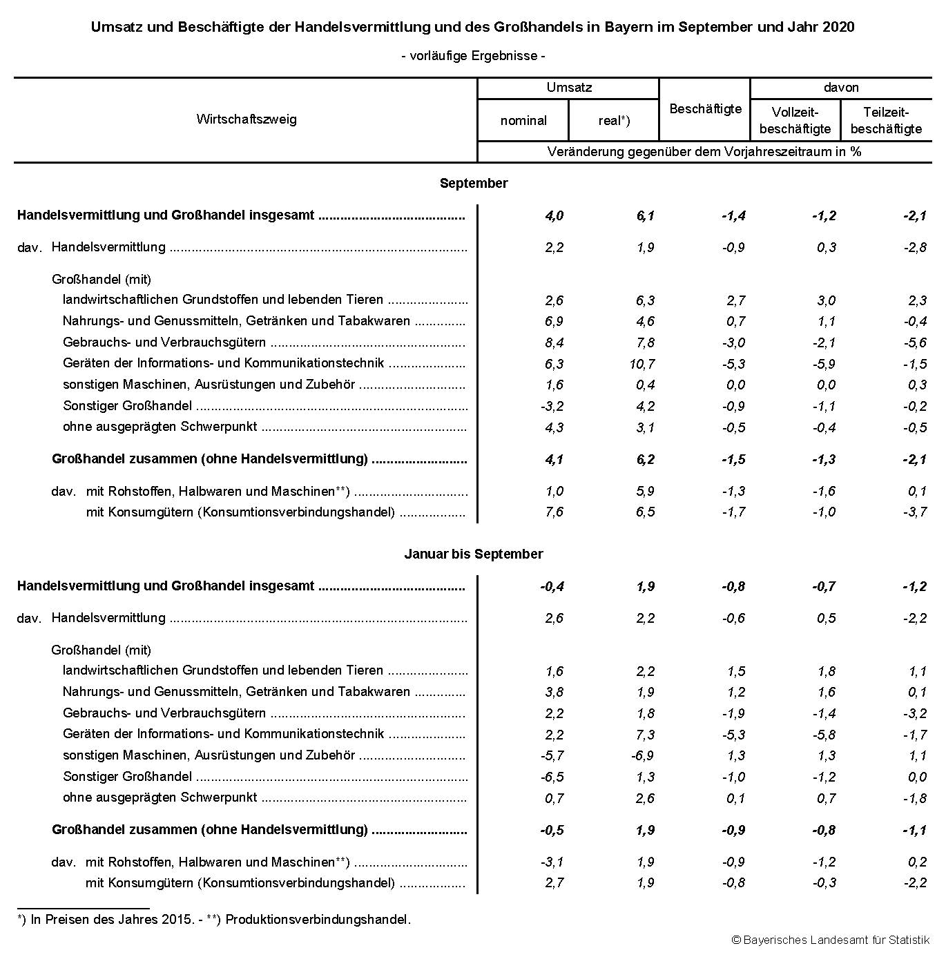 Im September 2020 stieg der nominale Umsatz im bayerischen Großhandel gegenüber dem September 2019 um 4,0 Prozent (real: +6,1 Prozent). Die Zahl der Beschäftigten sank gegenüber dem Vorjahresmonat um 1,4 Prozent.