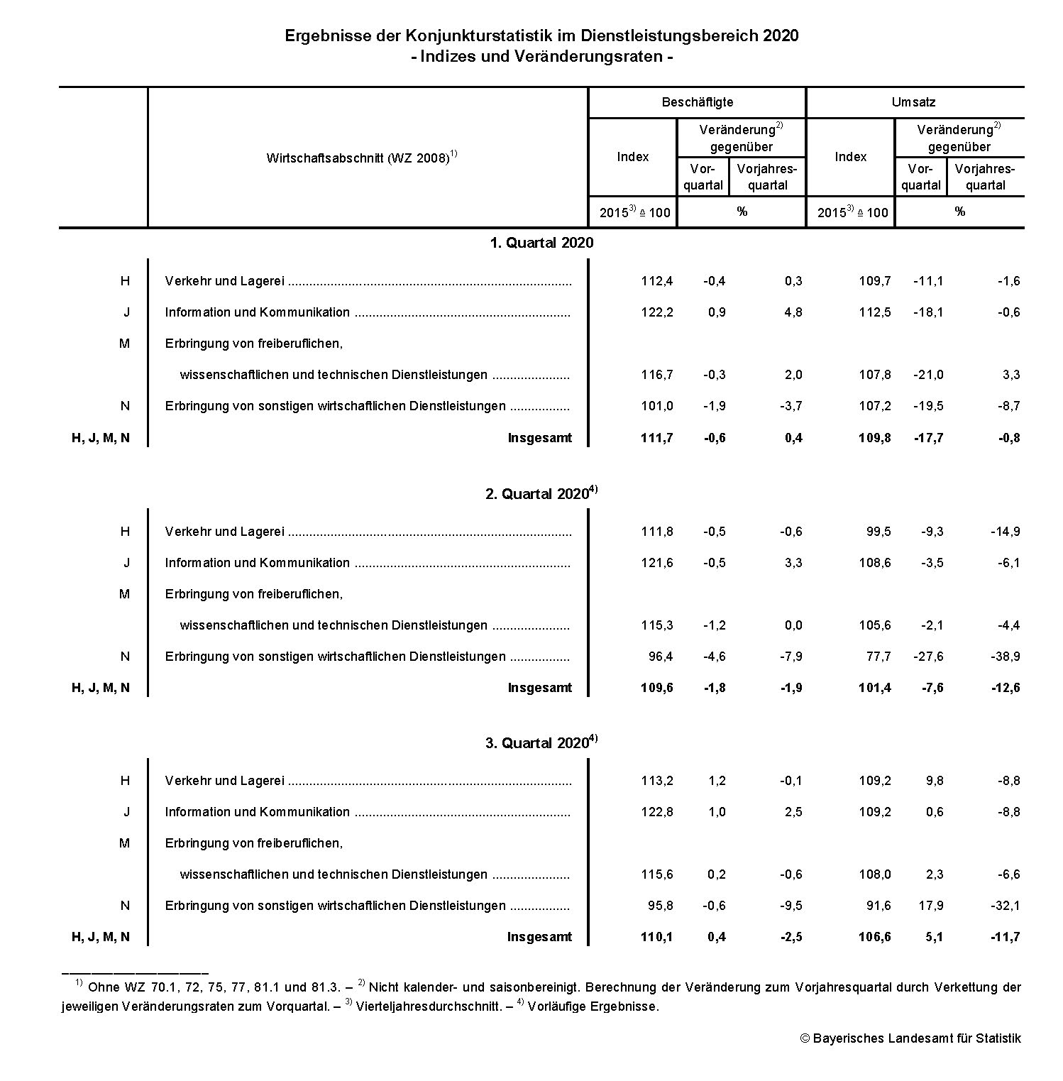 Die Zahl der Beschäftigten des Dienstleistungsbereichs in Bayern verringerte sich im dritten Vierteljahr 2020 gegenüber dem dritten Vierteljahr 2019 um 2,5 Prozent (Vorquartal: +0,4 Prozent). Im Wirtschaftsabschnitt H „Verkehr und Lagerei“ sank die Beschäftigtenzahl im Vorjahresvergleich um 0,1 Prozent (Vorquartal: +1,2 Prozent), im Wirtschaftsabschnitt M „Erbringung von freiberuflichen, wissenschaftlichen und technischen Dienstleistungen“ um 0,6 Prozent (+0,2 Prozent) und im Wirtschaftsabschnitt N „Erbringung von sonstigen wirtschaftlichen Dienstleistungen“ um 9,5 Prozent (-0,6 Prozent). Dem entgegen stieg die Anzahl der Beschäftigten im Wirtschaftsabschnitt J „Information und Kommunikation“ im Vergleich zum Vorjahresquartal (+2,5 Prozent) und zum Vorquartal (+1,0 Prozent).