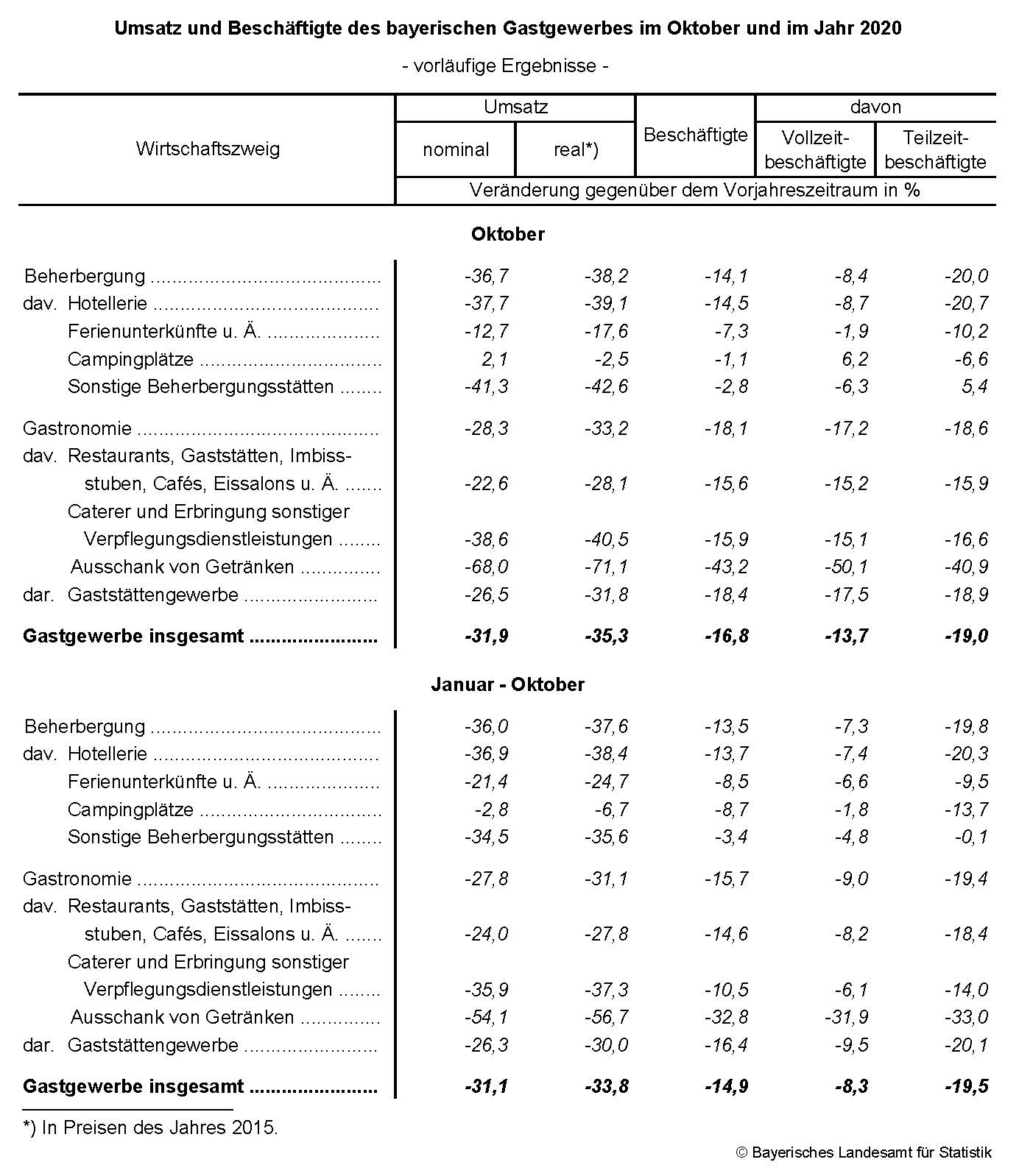 Nach den im Bayerischen Landesamt für Statistik vorliegenden, vorläufigen Ergebnissen zur Monatsstatistik im Gastgewerbe nahm der Umsatz im bayerischen Gastgewerbe im Oktober 2020 gegenüber dem Oktober 2019 nominal um 31,9 Prozent und real um 35,3 Prozent ab. Im Vergleich zum September 2020 sank der Umsatz um 16,2 Prozent. Die Zahl der Beschäftigten des Gastgewerbes ging im Vergleich zum Vorjahresmonat um 16,8 Prozent zurück, im Vergleich zum Vormonat verringerte sie sich um 4,4 Prozent.