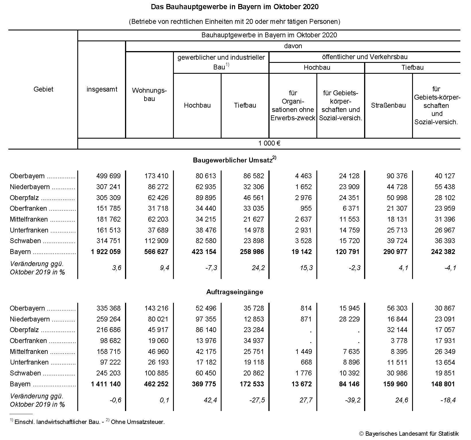 Nach Mitteilung des Bayerischen Landesamts für Statistik erzielte das bayerische Bauhauptgewerbe im Oktober 2020 einen baugewerblichen Umsatz von insgesamt 1,92 Milliarden Euro und damit ein Plus von 66,4 Millionen Euro bzw. 3,6 Prozent im Vergleich zum Vorjahresergebnis. An dieser insgesamt positiven Umsatzentwicklung waren vier von sieben Bausparten beteiligt, und zwar mit einer jeweiligen Zuwachsrate ab 4,1 Prozent (Straßenbau), wobei der gewerbliche und industrielle Tiefbau (+50,4 Millionen Euro bzw. +24,2 Prozent gegenüber Oktober 2019) sowie der Wohnungsbau (+48,5 Millionen Euro bzw. +9,4 Prozent) zur Umsatzsteigerung am stärksten beigetragen haben.
