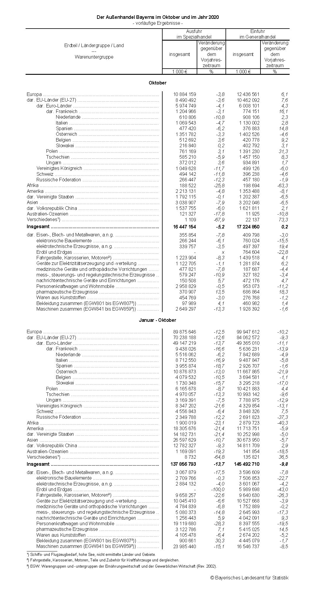 Von Januar bis Oktober 2020 sanken die Exporte der bayerischen Wirtschaft gegenüber den ersten zehn Monaten 2019 um 13,7 Prozent auf 137,9 Milliarden Euro, die Einfuhren nahmen zeitgleich um 9,8 Prozent auf 145,5 Milliarden Euro ab.