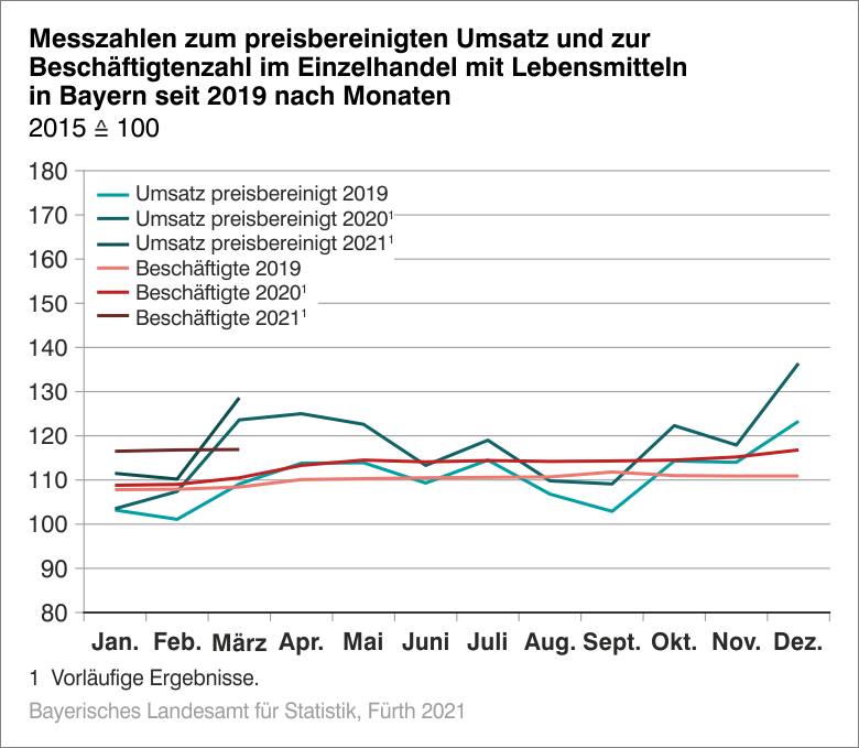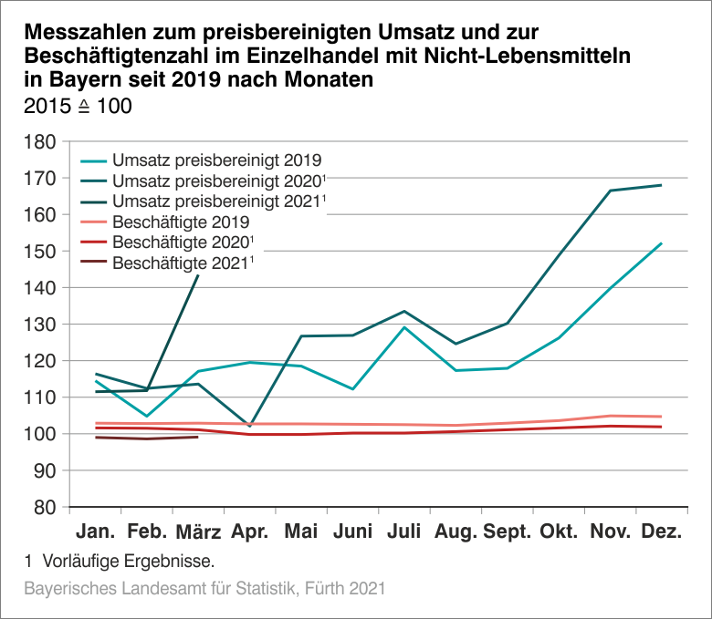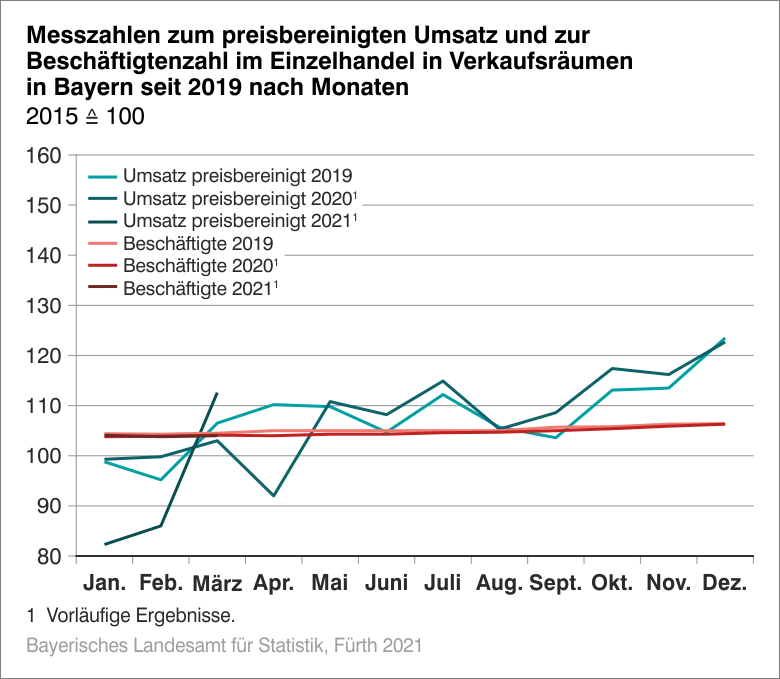 Im März 2021 wuchs der nominale Umsatz des bayerischen Einzelhandels gegenüber dem März 2020, dem Monat des ersten Lockdowns, nominal um 19,9 Prozent und real um 18,9 Prozent. Im Vergleich zum Februar 2021 nahm der Umsatz um 24,8 Prozent zu.