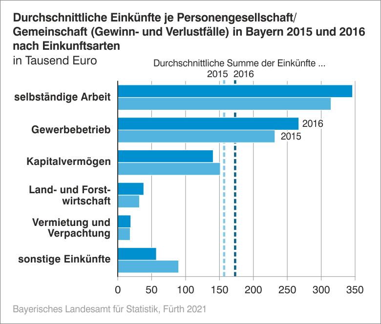 Nach Angaben des Bayerischen Landesamts für Statistik nahmen die bayerischen Finanzämter im Jahr 2016 für 217 414 Personengesellschaften und Gemeinschaften eine gesonderte und einheitliche Feststellung der Einkünfte vor. Diese Feststellung ist der Besteuerung der Gesellschafter bzw. Beteiligten vorgelagert. Insgesamt wurden dabei Einkünfte in Höhe von zusammen 37,63 Milliarden Euro ermittelt, das waren 13,0 Prozent mehr als im Vorjahr. 78,6 Prozent der Personengesellschaften und Gemeinschaften erzielten eine positive Summe der Einkünfte, die jedoch nur bei 0,5 Prozent der Fälle fünf Millionen Euro oder mehr betrug. 73,1 Prozent bzw. 27,52 Milliarden Euro der von Personengesellschaften und Gemeinschaften erwirtschafteten Einkünfte waren Einkünfte aus Gewerbebetrieb. Die Mehrzahl (64,1 Prozent) aller Personengesellschaften und Gemeinschaften bestand aus zwei Beteiligten Insgesamt wurden 1,48 Mio. Beteiligte erfasst.