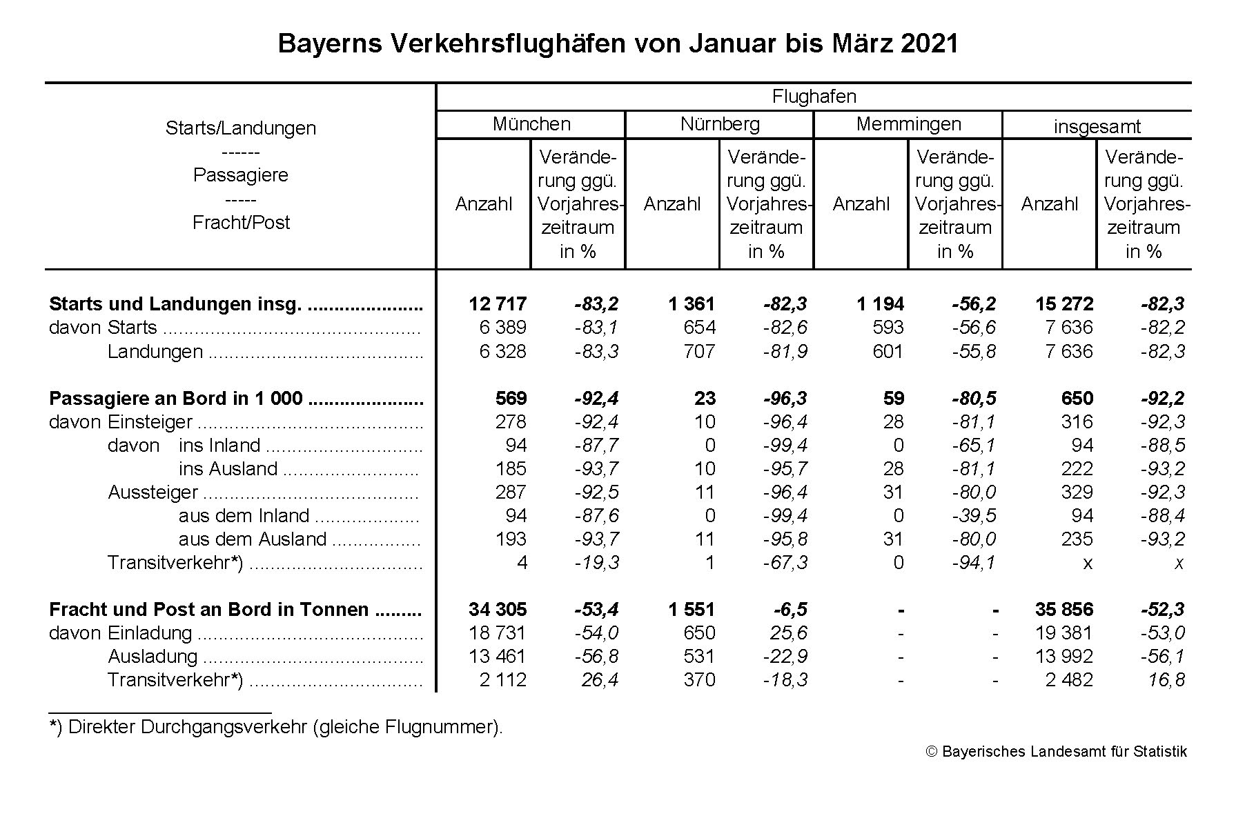 Insgesamt starteten bzw. landeten von Januar bis März 2021 rund 15 272 Flugzeuge auf den Verkehrsflughäfen München, Nürnberg und Memmingen (einschl. Transitverkehr). Das waren zusammengenommen 82,3 Prozent weniger als im Vorjahresquartal.