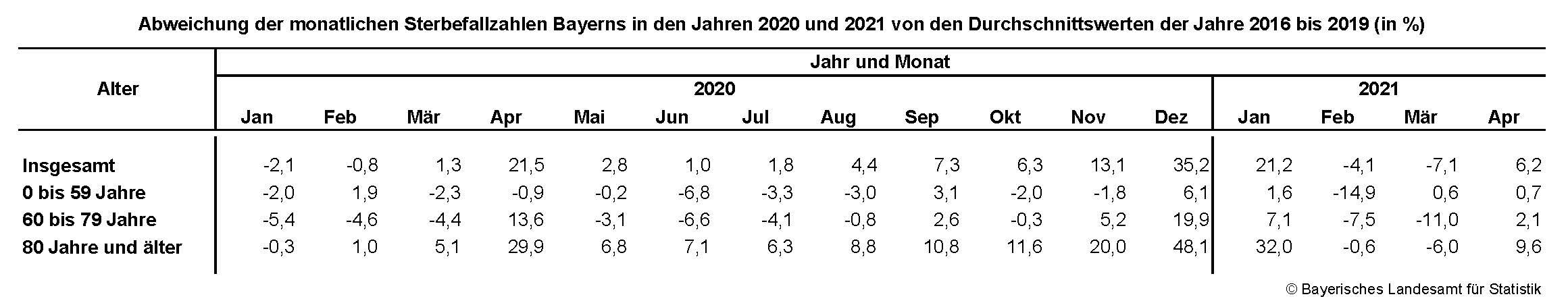 Für die beiden letzten Monate des Jahres 2020 sowie für den Januar 2021 registrierte das Bayerische Landesamt für Statistik deutlich erhöhte Sterbefallzahlen. Die Entwicklung folgte dabei dem Corona-Infektionsgeschehen und lag im Dezember 2020 bayernweit gut 35 Prozent und im Januar 2021 rund 21 Prozent über dem Durchschnitt der Jahre 2016 bis 2019. Im Februar und März 2021 lag die Zahl der Sterbefälle dann bayernweit leicht unter dem Durchschnitt der Vorjahre. Eine Auswertung aktueller vorläufiger Daten zeigt, dass die Zahl der Verstorbenen im April 2021 (11 438) niedriger war als zu Zeiten der ersten Welle im April 2020 (13 088) und sich damit auf einem ähnlichen Niveau bewegte wie in den Jahren 2016 bis 2019 (Durchschnitt: 10 769).