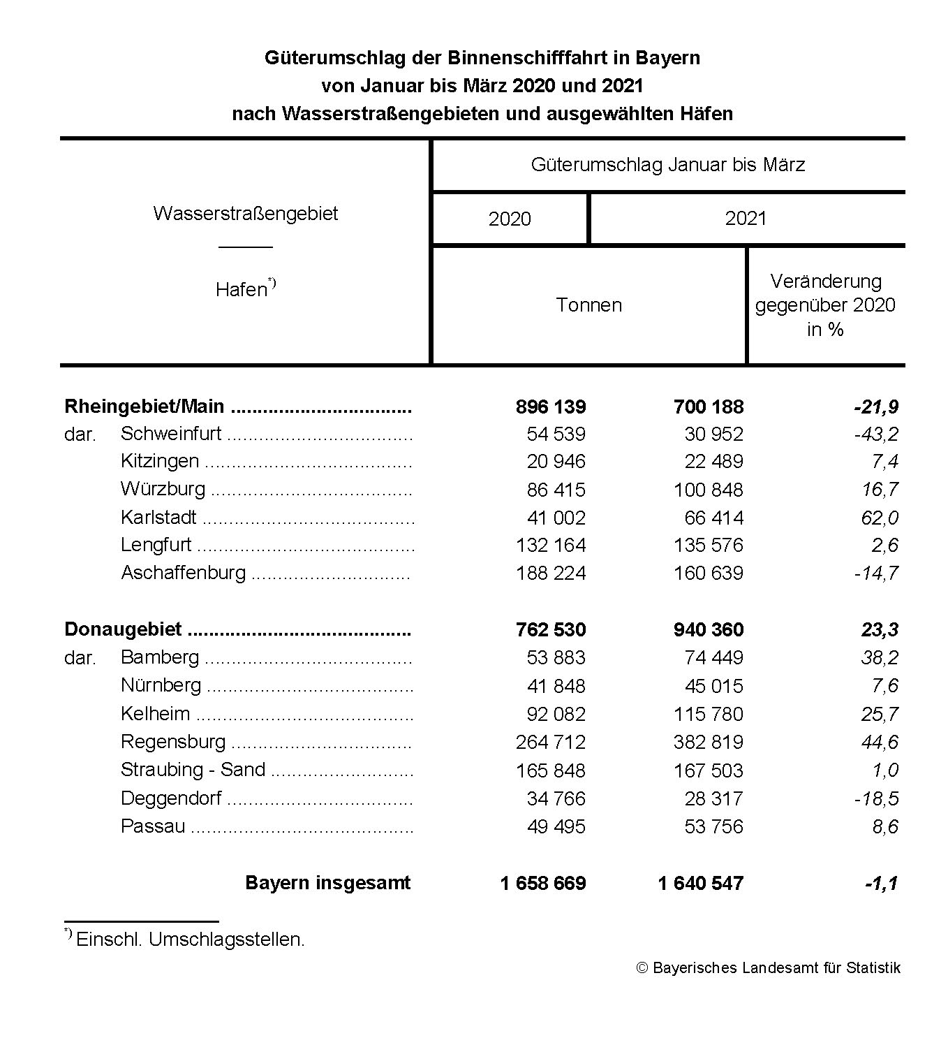 Der Güterumschlag an der Donau lag mit einer Zunahme um 23,3 Prozent bei 940 000 Tonnen und entsprach einem Anteil von 57,3 Prozent am Gesamtumschlag Bayerns. Im Rheingebiet/Main sank der Güterumschlag, auch bedingt durch den im Jahr 2020 abgeschlossenen Mainausbau, von Januar bis März 2021 um 21,9 Prozent auf rund 700 000 Tonnen. Die umschlagstärksten Häfen waren Regensburg mit rund 383 000 Tonnen und Straubing-Sand mit rund 168 000 Tonnen.