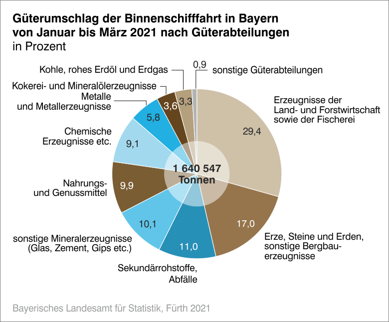 Auf den bayerischen Bundeswasserstraßen wurden im ersten Quartal 2021 hauptsächlich „Erzeugnisse der Land- und Forstwirtschaft“ (29,4 Prozent) und „Erze, Steine und Erden“ (17,0 Prozent) transportiert. Weitere 11,0 Prozent entfielen auf die Abteilung „Sekundärrohstoffe, Abfälle“.