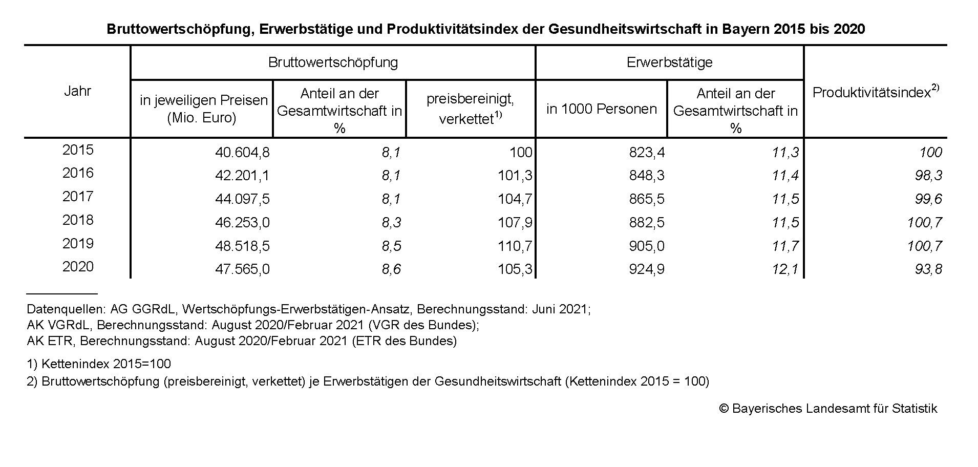 Das Bayerische Landesamt für Statistik meldet für die bayerische Gesundheitswirtschaft 2020 eine Bruttowertschöpfung von rund 47,6 Mrd. Euro, die von rund 925 000 Erwerbstätigen erwirtschaftet wurde. Die preisbereinigte Bruttowertschöpfung in der Gesundheitswirtschaft ist im Vergleich zum Vorjahr um 4,8 Prozent gesunken. Die Bruttowertschöpfung aller Wirtschaftsbereiche fiel 2020 um 5,8 Prozent. Die Zahl der Erwerbstätigen in der Gesundheitswirtschaft hat von 2019 auf 2020 um 2,2 Prozent zugenommen. In allen Wirtschaftsbereichen nahm sie in Bayern im Jahr 2020 um 1,0 Prozent ab.