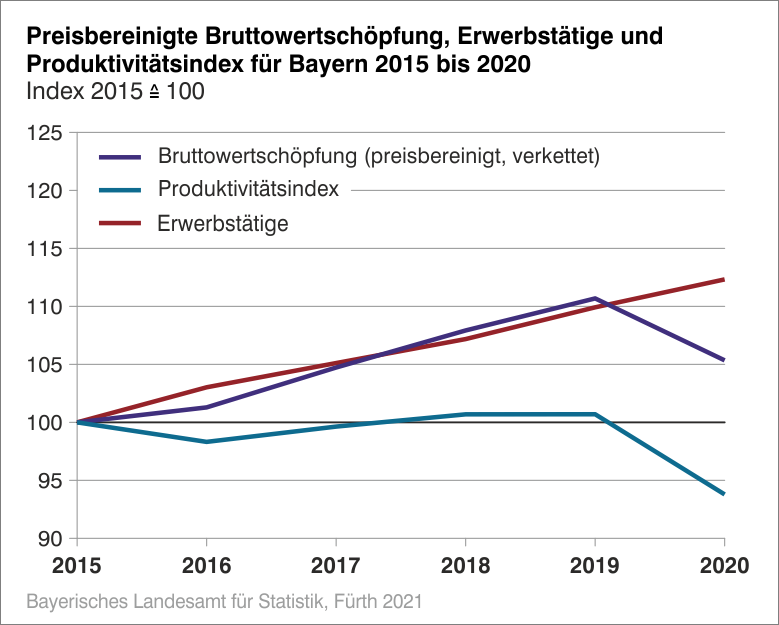 Da die Zahl der Erwerbstätigen in der Gesundheitswirtschaft 2020 zugenommen hat, die Bruttowertschöpfung 2020 im Vergleich zum Vorjahr jedoch zurückging, war die Produktivität im Jahr 2020 rückläufig. Der sogenannte Produktivitätsindex, gemessen als preisbereinigte Bruttowertschöpfung je Erwerbstätigen in der bayerischen Gesundheitswirtschaft, ist im Jahr 2020 in Relation zum Jahr 2019 in Bayern um insgesamt 6,9 Prozent gesunken.