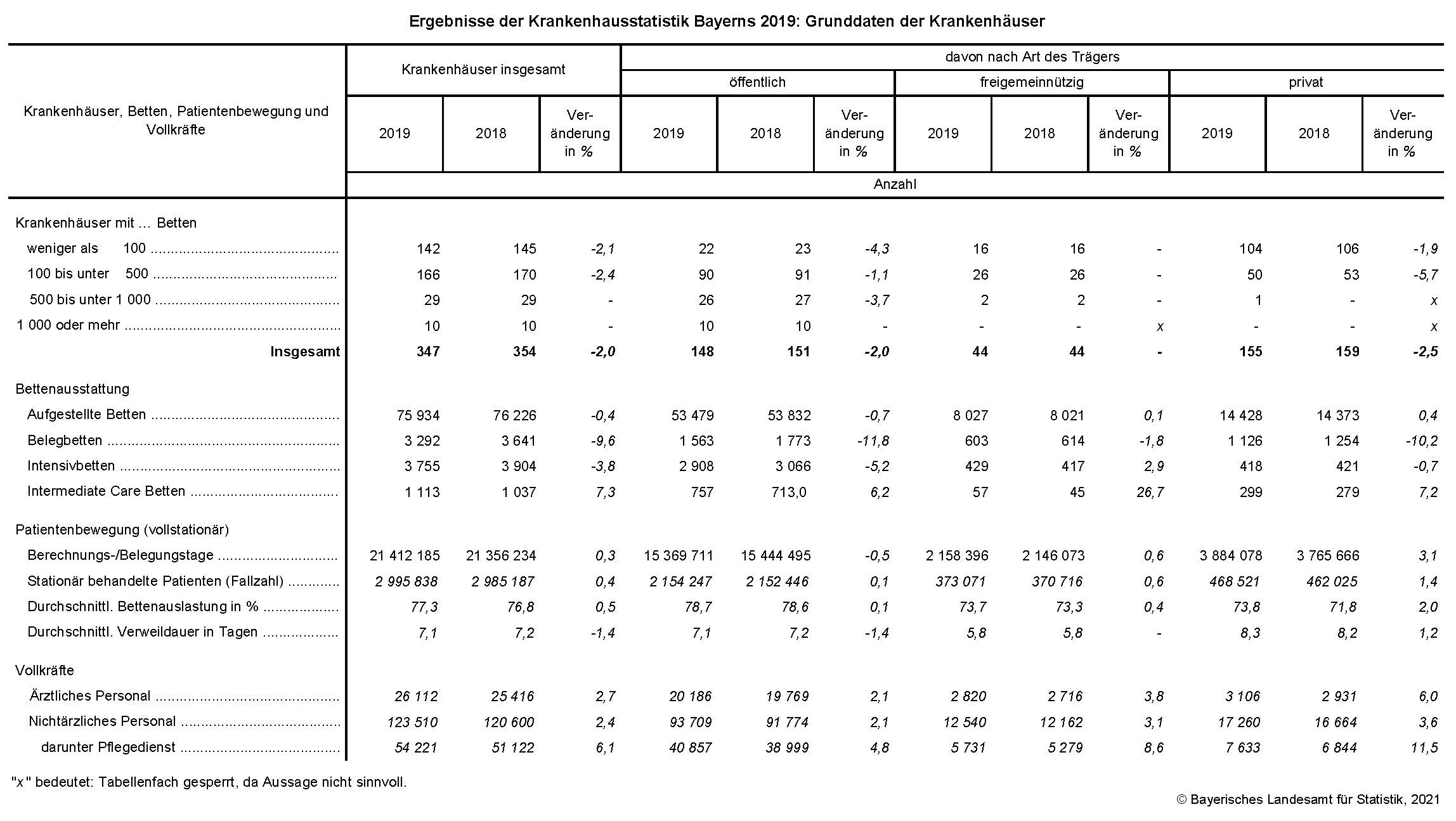 Nach Angaben des Bayerischen Landesamts für Statistik wurden im Jahr 2019 insgesamt 3,0 Millionen Patientinnen und Patienten (Fallzahl) vollstationär in den 347 bayerischen Krankenhäusern behandelt. Damit lag die Anzahl der vollstationären Patientinnen und Patienten leicht höher als im Vorjahr 2018 (+0,4 Prozent). Weiterhin fielen 21,41 Millionen Berechnungs- und Belegungstage an (+0,3 Prozent gegenüber 2018). Die durchschnittliche Verweildauer pro Patient belief sich auf 7,1 Tage (Vorjahreswert: 7,2 Tage). Insgesamt 75 934 Betten standen im Jahresdurchschnitt 2019 in den bayerischen Krankenhäusern bereit (-0,4 Prozent gegenüber 2018), darunter 3 755 Intensivbetten (-3,8 Prozent). Die Bettenauslastung betrug im Jahr 2019 durchschnittlich 77,3 Prozent; bei den Intensivbetten lag die durchschnittliche Bettenauslastung bei 77,1 Prozent. Von allen aufgestellten Betten befanden sich 70,4 Prozent in Krankenhäusern mit öffentlicher Trägerschaft.