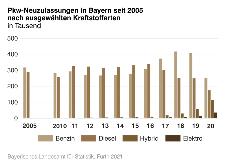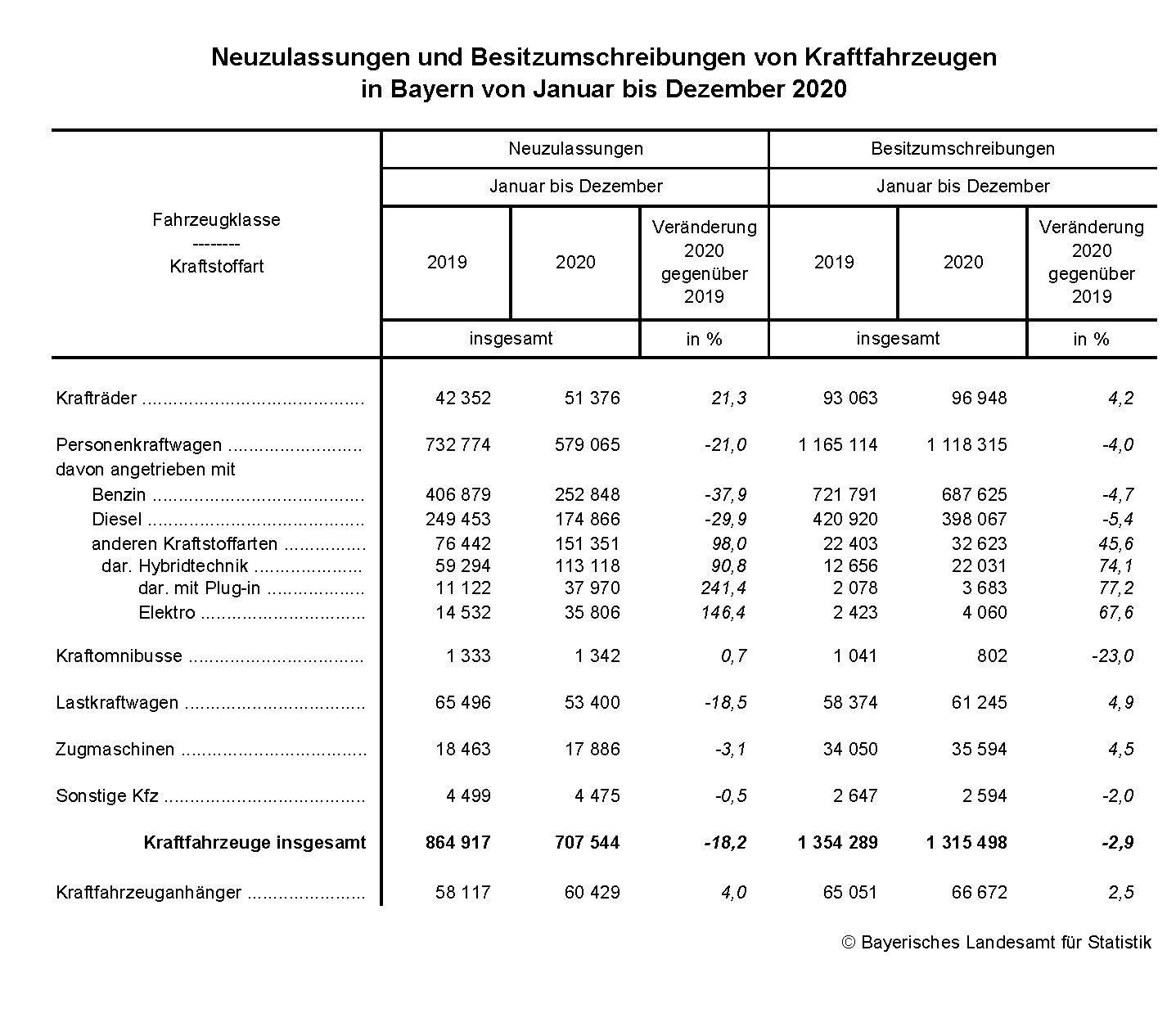 Nach der aktuellen Auswertung der Statistik des Kraftfahrt-Bundesamtes wurden im von der Corona-Krise geprägten Jahr 2020 in Bayern 707 544 Kraftfahrzeuge (Kfz) neu zugelassen. Das waren 18,2 Prozent weniger als im Vorjahr. Wie das Bayerische Landesamt für Statistik weiter mitteilt, nahmen die Zulassungszahlen von Personenkraftwagen (Pkw) um 21,0 Prozent auf 579 065 ab. Insbesondere die Neuanmeldungen von Benzinern verringerten sich um 37,9 Prozent auf 252 848, die von Diesel-Pkw um 29,9 Prozent auf 174 866. Dagegen stieg die Beliebtheit von Pkw mit alternativen Antriebsarten (Gas, Elektro, Hybrid) weiter an. Die Zahl der Erstanmeldungen verdoppelte sich hier gegenüber 2019 und erreichte damit einen Anteil von 26,1 Prozent an allen neu zugelassenen Pkw. – Besitzumschreibungen sanken um 2,9 Prozent auf 1 315 498 Kfz.