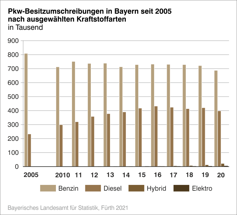 Wie das Bayerische Landesamt für Statistik weiter mitteilt, sanken Pkw-Neuzulassungen um 21,0 Prozent auf 579 065 Fahrzeuge. Davon nutzen 252 848 Fahrzeuge Benzin (-37,9 Prozent), 174 866 Diesel (-29,9 Prozent) und 151 351 andere Kraftstoffarten wie Gas, Elektro, Hybrid (+98,0 Prozent).