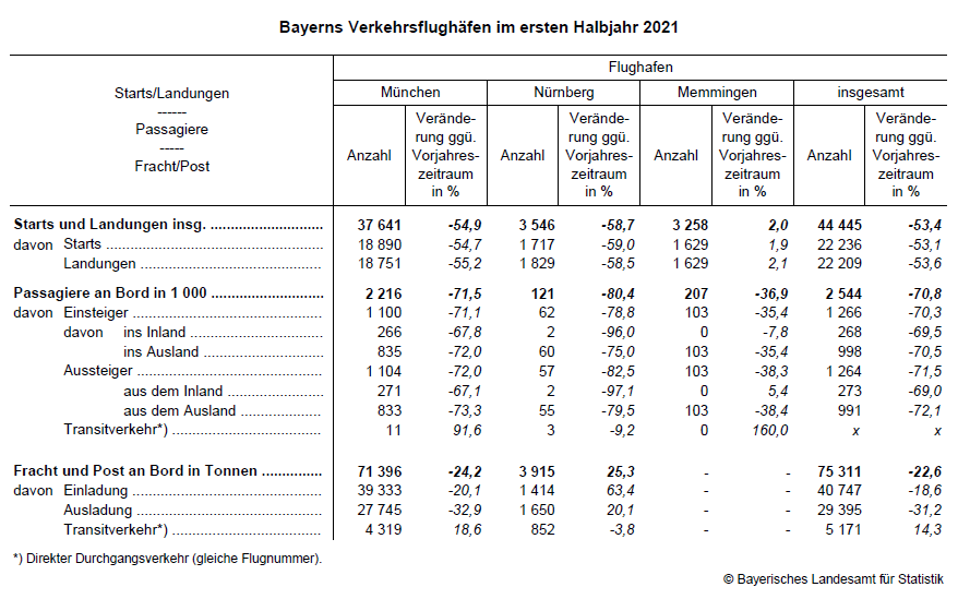 An Bayerns größtem Flughafen München sinkt im ersten Halbjahr 2021 die Zahl der Fluggäste an Bord um 71,5 Prozent auf rund 2,2 Millionen bei 37 641 Starts und Landungen (-54,9 Prozent). Über 75 Prozent der Ein- und Aussteiger kamen von Januar bis Juni 2021 aus dem Ausland oder flogen ins Ausland. Das Fracht- und Postaufkommen sinkt um 24,2 Prozent auf 71 396 Tonnen (einschl. Transitverkehr).