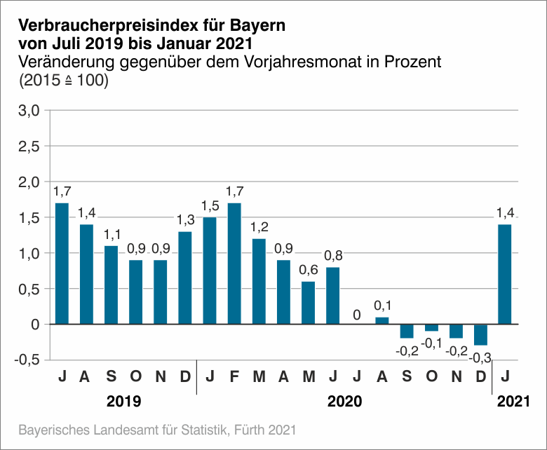 Nach Angaben des Bayerischen Landesamts für Statistik lag die Inflationsrate, gemessen als Veränderung des Verbraucherpreisindex für Bayern gegenüber dem entsprechenden Vorjahresmonat in Prozent, im Januar 2021 bei 1,4 Prozent und damit wieder auf dem Niveau vor der temporären Mehrwertsteuersenkung. Die sogenannte Kerninflationsrate, also der Gesamtindex ohne Nahrungsmittel und Energie, betrug 1,7 Prozent.