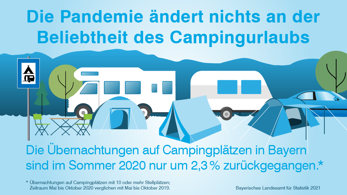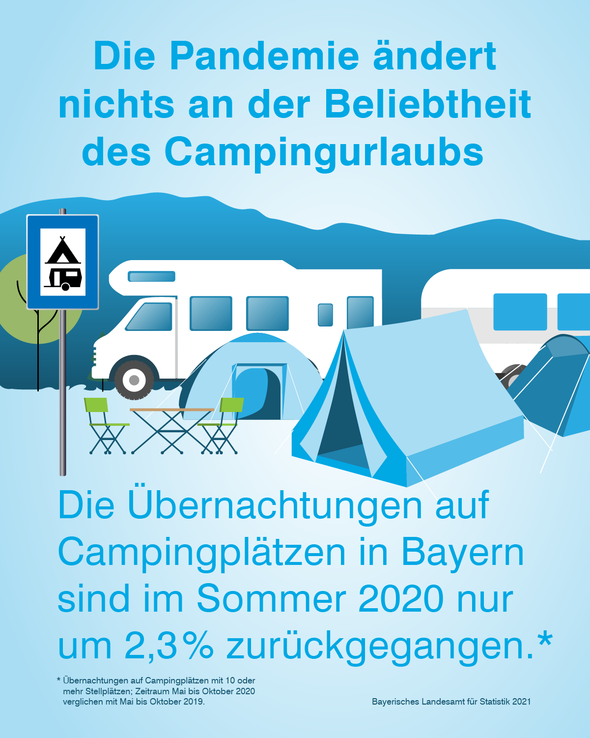 Auch im aktuellen Jahr ist Campen sehr beliebt: Im ersten Halbjahr 2021 zählen die bayerischen Campingplätze 1,3 Millionen Übernachtungen. Das entspricht einer Mehrung von 16,1 Prozent zum entsprechendem Halbjahresvergleich 2020 trotz Lockdown-Zeiten.