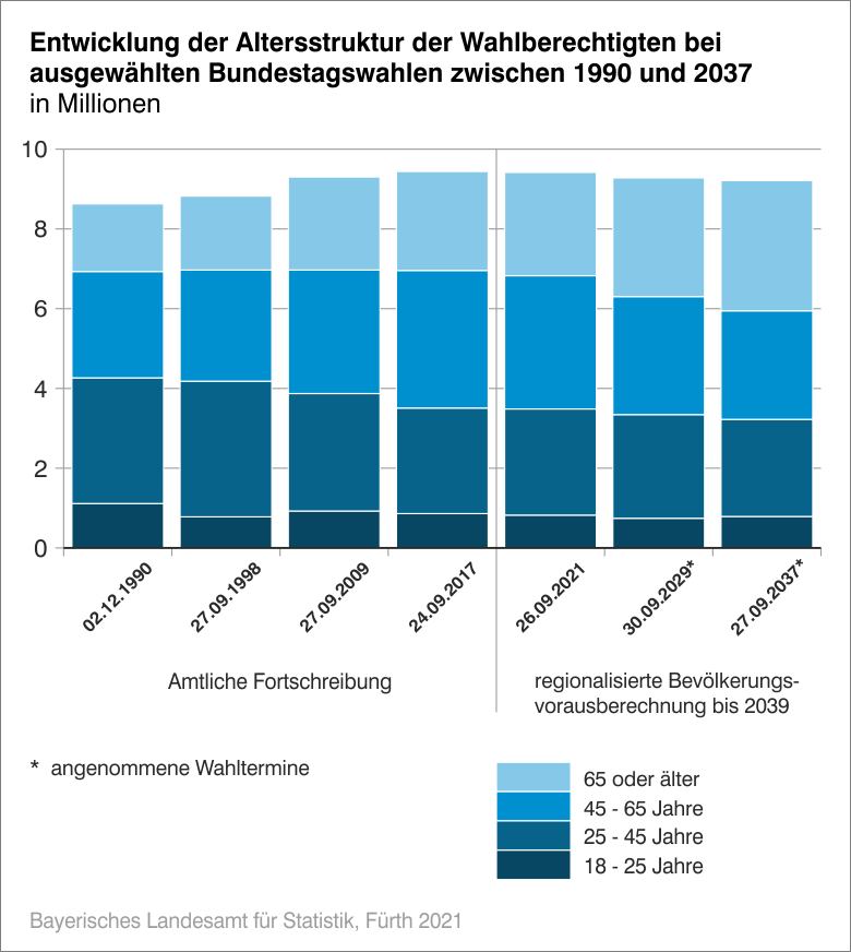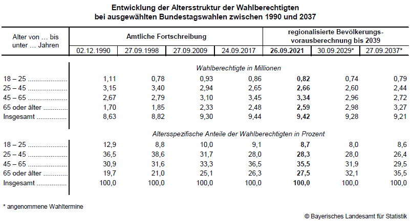Bei der Wahl zum 20. Deutschen Bundestag am 26. September 2021 werden nach einer Schätzung des Bayerischen Landesamtes für Statistik rund 9,4 Millionen Wahlberechtigte in Bayern leben. Dabei ist die Zahl der Wahlberechtigten im Freistaat seit der Bundestagswahl im Jahr 1990 um 0,8 Millionen bzw. 9,1 Prozent angestiegen. Bis zur Bundestagswahl im Jahr 2037 wird die Zahl der Wahlberechtigten dagegen voraussichtlich um 0,2 Millionen bzw. 2,2 Prozent zurückgehen.