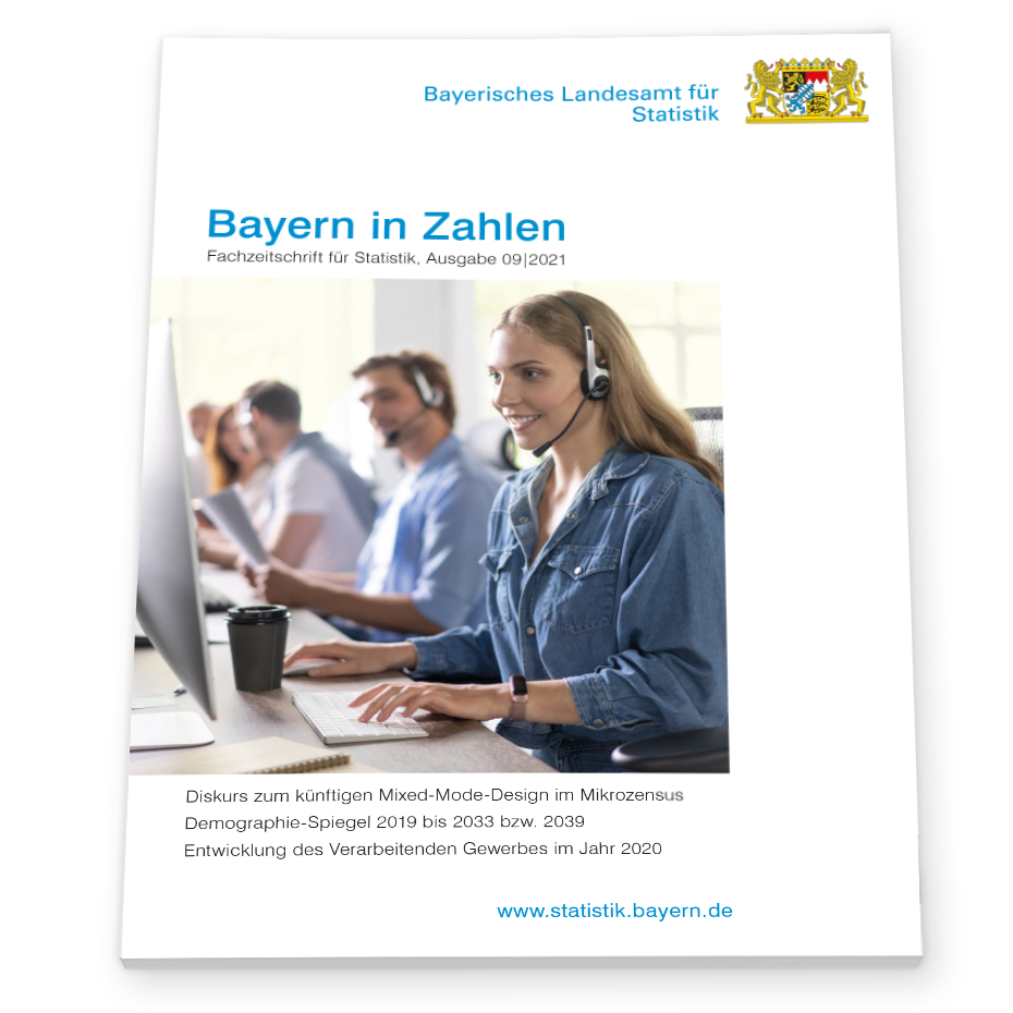 Als Datei ist die Monatszeitschrift „Bayern in Zahlen“ unter www.statistik.bayern.de/produkte/biz kostenlos abrufbar. Die Druckausgabe (Bestell-Nr. Z10002 202109: Einzelheft 4,80 €, Jahresabonnement 46,- €) kann beim Vertrieb per E-Mail (vertrieb@statistik.bayern.de), Telefon (0911 98208-6311) oder Fax (0911 98208-6638) bestellt werden