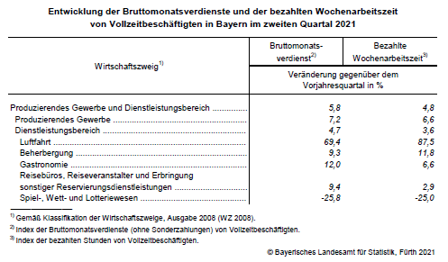Die Bruttomonatsverdienste ohne Sonderzahlungen der Vollzeitbeschäftigten in Bayern steigen im zweiten Quartal 2021 um 5,8 Prozent gegenüber dem Vorjahresquartal. Die Verdienstzuwächse fallen im Produzierenden Gewerbe mit 7,2 Prozent stärker aus als im Dienstleistungsbereich mit 4,7 Prozent. In den Wirtschaftszweigen „Beherbergung“ (9,3Prozent), „Gastronomie“ (12,0 Prozent) sowie „Reisebüros, Reiseveranstalter und Erbringung sonstiger Reservierungsdienstleistungen“ (9,4 Prozent) verzeichnet das Bayerische Landesamt für Statistik im Vergleich zum zweiten Quartal 2020 steigende Verdienste. In der Luftfahrt fällt der Verdienstanstieg gegenüber dem Vorjahresquartal mit 69,4 Prozent besonders groß aus. Hingegen ist im Spiel-, Wett- und Lotteriewesen noch ein hoher Verdienstrückgang gegenüber dem Vorjahresquartal ablesbar. Grund: anhaltende Kurzarbeit mit 25,8 Prozent.