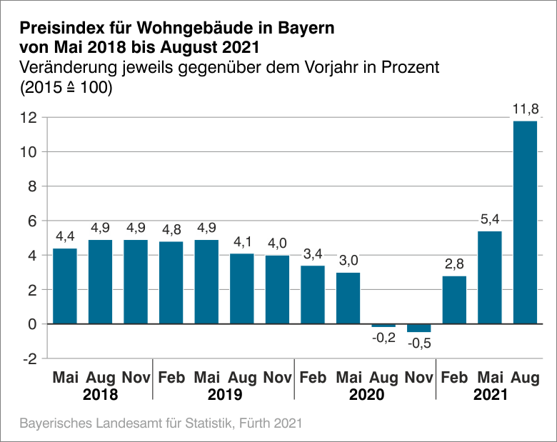 Der Preisindex für den Neubau von Wohngebäuden in Bayern erreicht im August 2021 einen Stand von 129,2 (2015≙100). Im Vergleich zum entsprechenden Vorjahresmonat entspricht dies einer durchschnittlichen Preissteigerung von 11,8 Prozent. Die hohe Preissteigerung lässt sich zumindest zum Teil mit dem Basiseffekt, der sich durch die Mehrwertsteuersenkung in der zweiten Jahreshälfte 2020 ergibt, erklären.