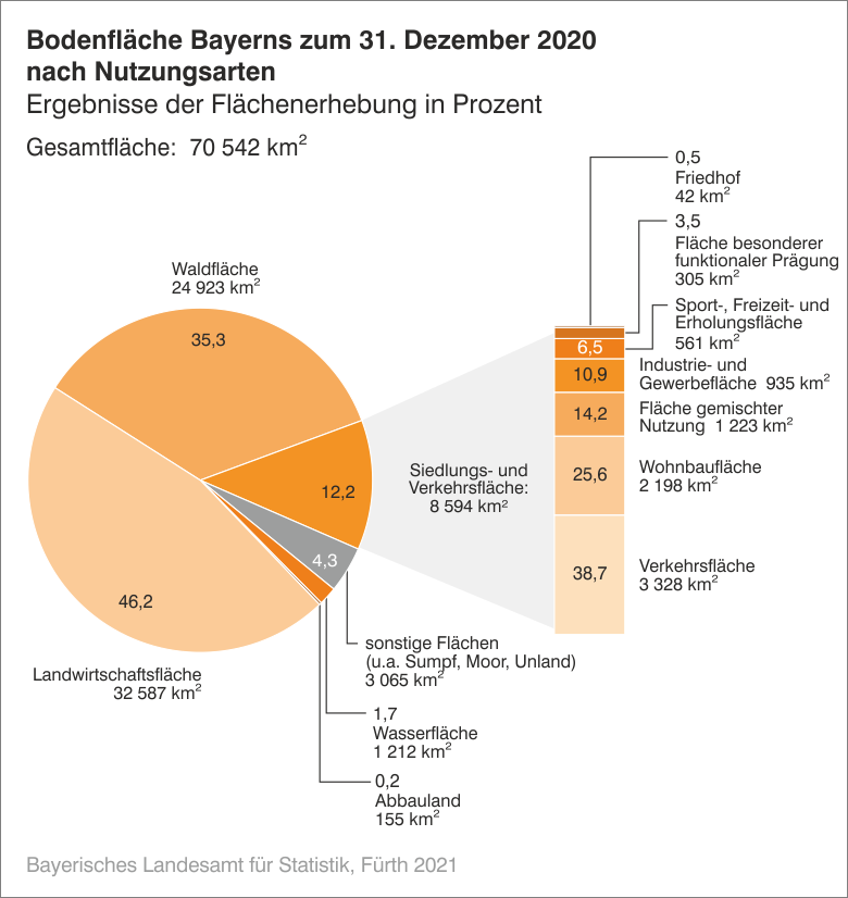 Mit 46,2 Prozent wird Ende 2020 etwa die Hälfte der Gesamtfläche Bayerns landwirtschaftlich genutzt. Ein weiteres gutes Drittel des Freistaats besteht zum Berichtszeitraum aus Wald (35,3 Prozent). 859 434 Hektar bzw. 12,2 Prozent der Fläche Bayerns dienen Siedlungs- und Verkehrszwecken.