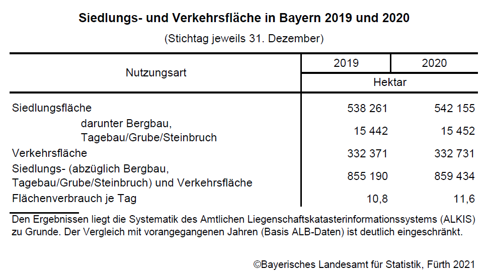 Wie das Expertenteam des Bayerischen Landesamts für Statistik weiter mitteilt, nimmt die Siedlungs- und Verkehrsfläche binnen Jahresfrist um 4 244 Hektar bzw. 0,5 Prozent zu. Der tägliche Flächenverbrauch liegt damit im Jahr 2020 bei durchschnittlich 11,6 Hektar. Im Jahr zuvor: 10,8 Hektar pro Tag.