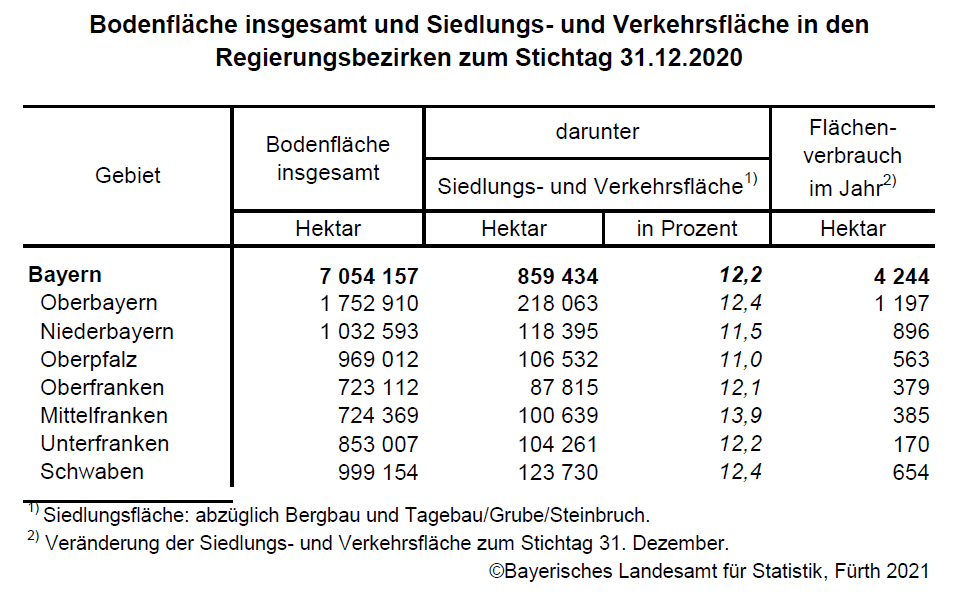 In den Regierungsbezirken liegt der Anteil der Siedlungs- und Verkehrsfläche an der jeweiligen Gesamtfläche zwischen 11,0 Prozent (Oberpfalz) und 13,9 Prozent (Mittelfranken). Am deutlichsten wächst die Siedlungs- und Verkehrsfläche mit einem Plus von 0,8 Prozent (896 Hektar insgesamt) im Jahr 2020 in Niederbayern. Die kleinste Zuwachsrate verzeichnet das Statistische Landesamt im selben Jahr mit +0,2 Prozent (170 Hektar insgesamt) in Unterfranken.