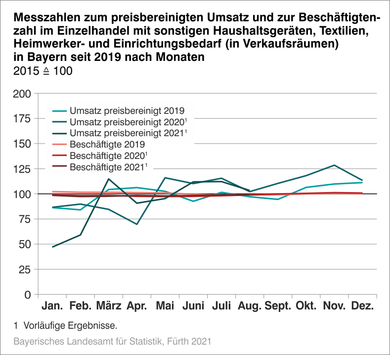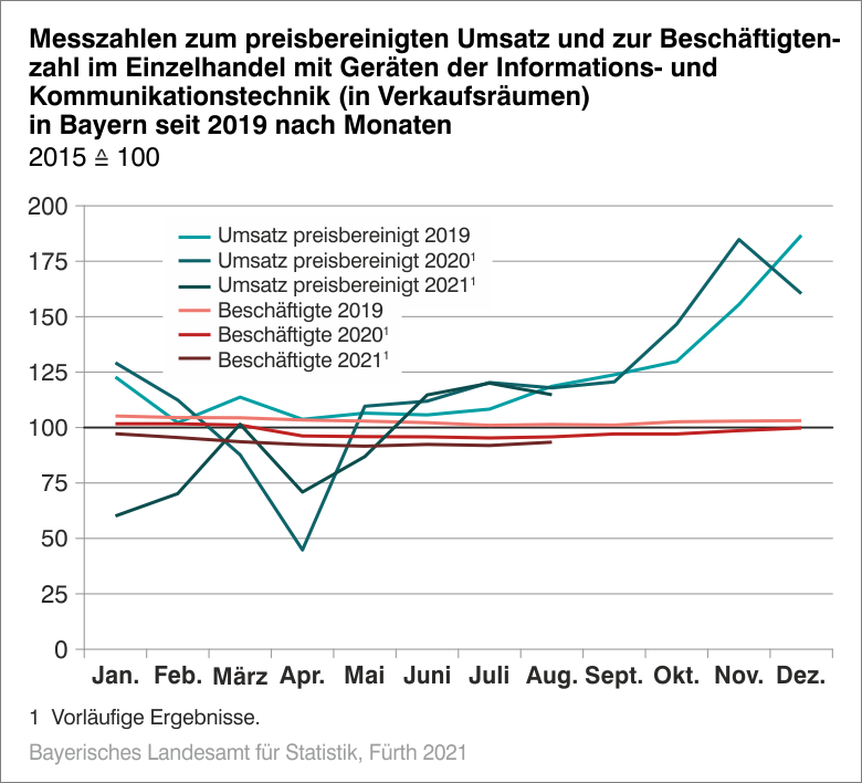 Fürth/Schweinfurt. Die Expertinnen und Experten des Bayerischen Landesamts für Statistik teilen weiter mit, dass der nominale Umsatz des Einzelhandels von Januar bis August 2021 im Vergleich zum Vorjahreszeitraum um 7,7 Prozent zunimmt. Preisbereinigt erhöht sich der Umsatz um 6,2 Prozent. Die Zahl der Beschäftigten steigt in diesem Betrachtungszeitraum um 1,0 Prozent.