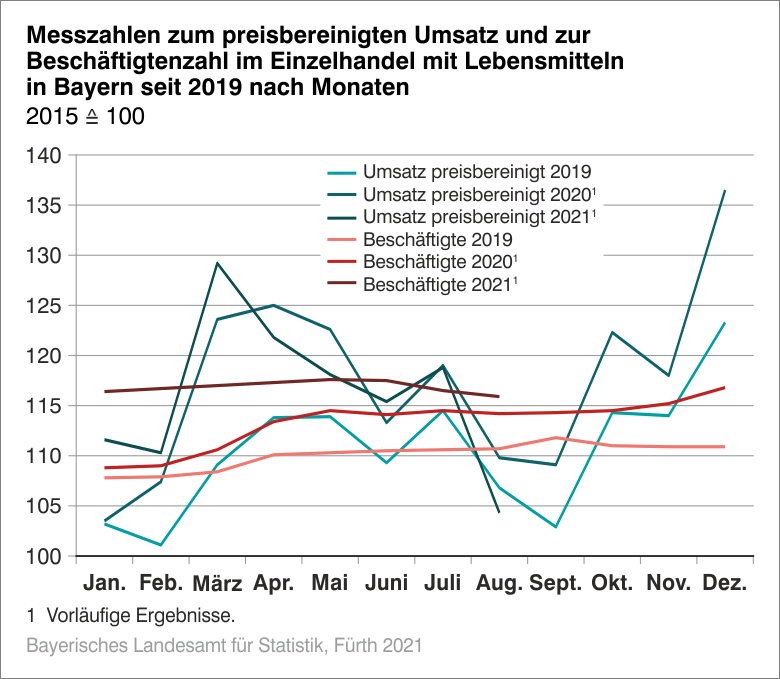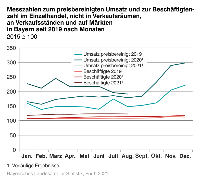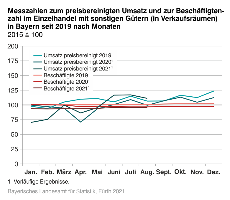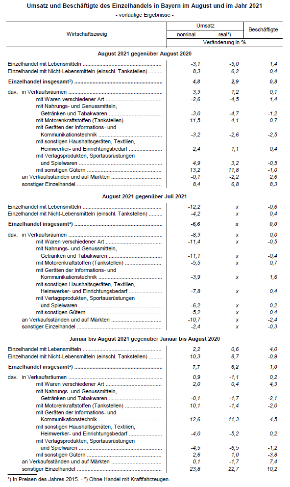 Wie das Bayerische Landesamt für Statistik nach vorläufigen Ergebnissen der „Monatsstatistik im Einzelhandel“ berichtet, steigt der Umsatz im bayerischen Einzelhandel (ohne Kraftfahrzeughandel) im August 2021 im Vergleich zum Vorjahresmonat nominal um 4,8 Prozent und preisbereinigt um 2,9 Prozent. Im Vergleich zum Juli 2021 nimmt der nominale Umsatz um 6,6 Prozent ab. Die Zahl der Beschäftigten wächst um 0,8 Prozent und bleibt gegenüber Vormonat konstant.