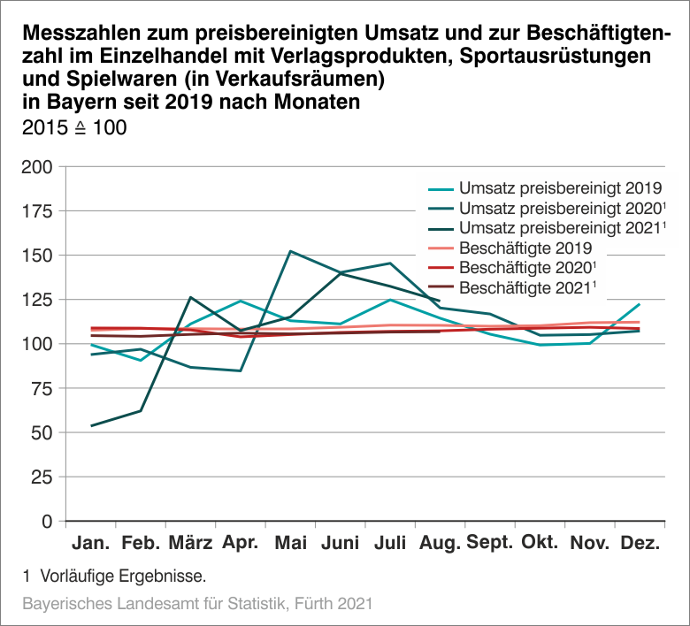 Ausführliche Ergebnisse enthält der voraussichtlich in Kalenderwoche 41 erscheinende Statistische Bericht „Umsatz und Beschäftigte im bayerischen Einzelhandel im August 2021 (Bestellnummer: G1100C 202108)“. Weitere Informationen zum Bezug von Druckausgaben erhalten Sie beim Vertrieb per E-Mail (vertrieb@statistik.bayern.de), Telefon (0911 98208-6311) oder Fax (0911 98208-6638).
