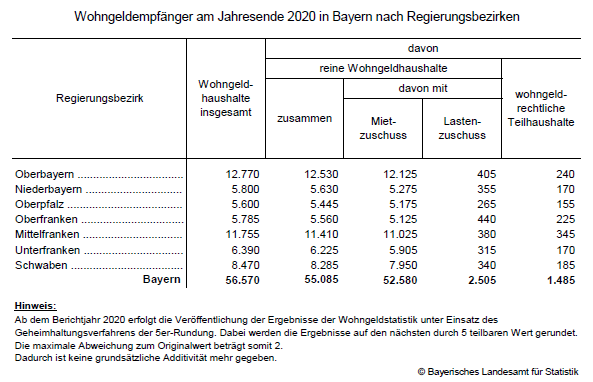 Nach Angaben des Expertenteams des Bayerischen Landesamtes für Statistik gibt es zum Jahresende 2020 in Bayern insgesamt 55 085 reine Wohngeldhaushalte - das heißt, alle zum Haushalt zählenden Personen sind wohngeldberechtigt. Gegenüber 2019 mit 39 843 Wohngeldhaushalten entspricht das einem Plus von 38,3 Prozent.