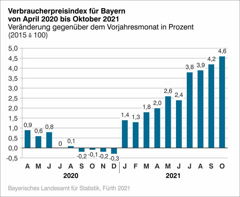 Die Inflationsrate, gemessen als prozentuale Veränderung des Verbraucherpreisindex für Bayern gegenüber dem entsprechenden Vorjahresmonat, liegt im Oktober 2021 bei 4,6 Prozent. Ursächlich für diese starke Zunahme sind nicht nur hohe Preissteigerungen am Energiemarkt, sondern auch die von Juli bis Dezember 2020 eingeführte Mehrwertsteuersenkung. Die sogenannte Kerninflationsrate, also der Gesamtindex ohne Nahrungsmittel und Energie, beträgt lediglich 3,1 Prozent.