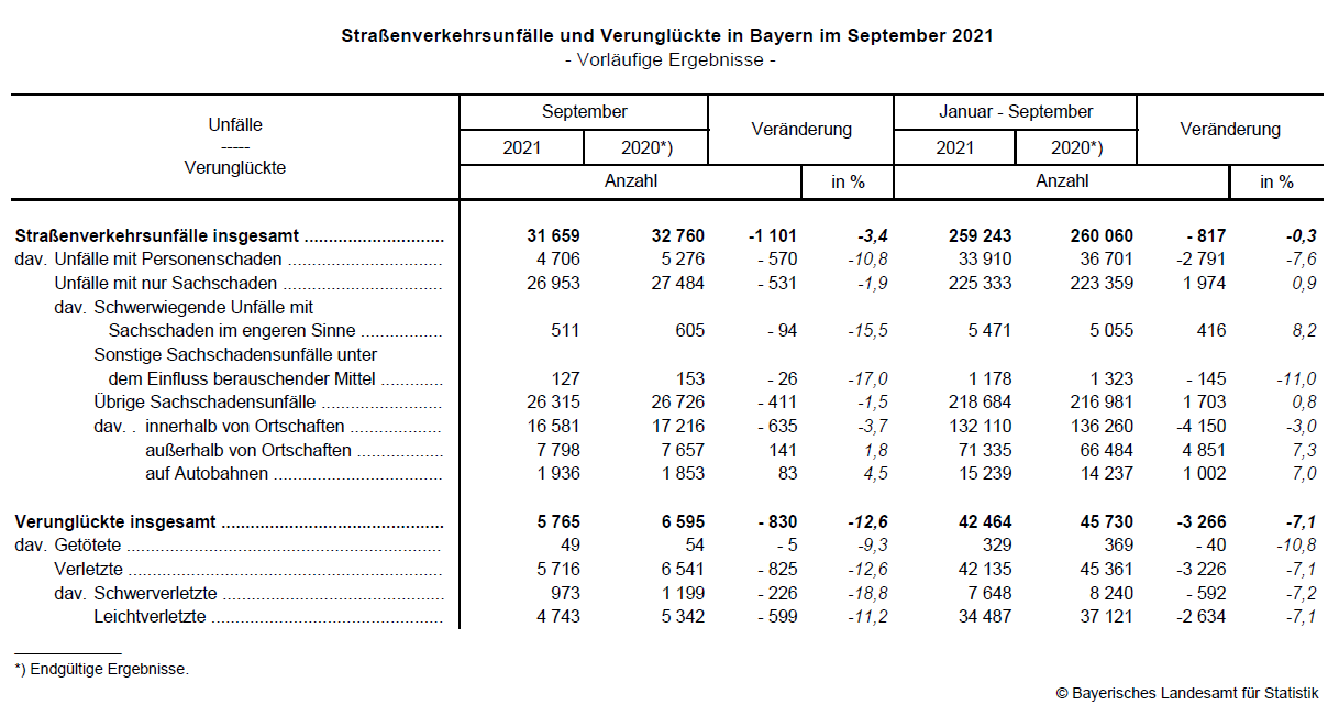 Fürth/Schweinfurt. Auf Bayerns Straßen ereignen sich im Monat September 2021 weniger Straßenverkehrsunfälle als im Vorjahresmonat. Wie die Expertinnen und Experten des Bayerischen Landesamts für Statistik nach vorläufigen Ergebnissen der Polizei mitteilen, sinkt deren Zahl auf 31 659 (September 2020: 32 760). Bei 4 706 dieser Unfälle kommen Personen zu Schaden – gegenüber September 2020 ein Rückgang um 10,8 Prozent.