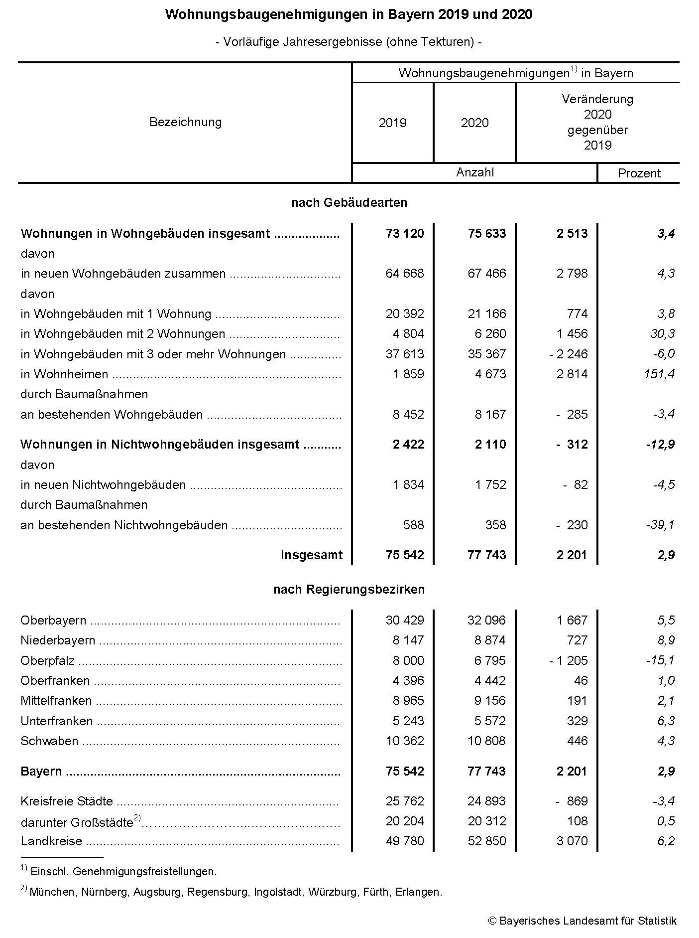 Von den unteren Bauaufsichtsbehörden in Bayern wurden im Jahr 2020 insgesamt 77 743 Wohnungsbaugenehmigungen (einschließlich Genehmigungsfreistellungsverfahren) erteilt. Wie das Bayerische Landesamt für Statistik nach vorläufigen Ergebnissen der amtlichen Baugenehmigungsstatistik für das aktuelle Berichtsjahr weiter mitteilt, wurden damit im Jahr 2020 insgesamt 2 201 bzw. 2,9 Prozent mehr Wohnungen zum Bau freigegeben als im Vorjahr. Die meisten dieser Wohnungen sollen in neuen Wohngebäuden entstehen (67 466 bzw. 86,8 Prozent; +4,3 Prozent gegenüber 2019). Durch Baumaßnahmen am Gebäudebestand sind 8 525 Wohnungen projektiert und in neuen Nichtwohngebäuden (gewerbliche Hochbauten) sollen 1 752 Wohnungen realisiert werden (-5,7 Prozent bzw. -4,5 Prozent).
